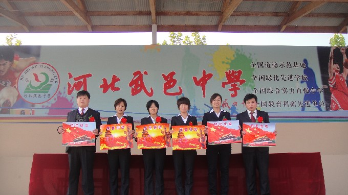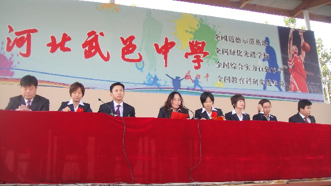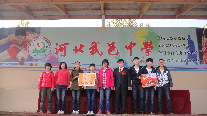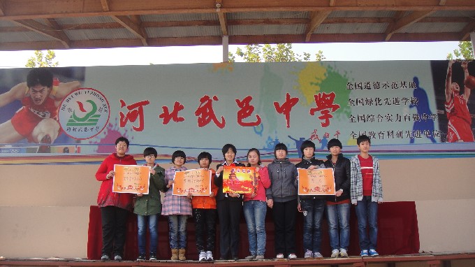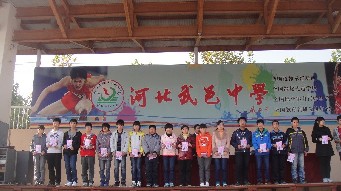 11月9日,初中部在武中操场举行了2012-2013学年第一学期期中表彰大会。在主席台就座的是:初中部教导主任李玉乔、主任助理郭嘉民以及获得“明星班级”称号的六位班主任李立行、刘亚琴、姜敬竹、宋娜、李静、沙书广老师。在这次大会上,初中部首次推选出各班“十佳少年”予以表彰。