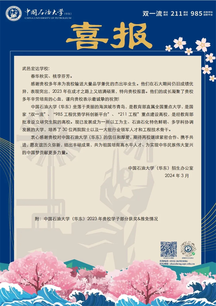 喜讯|中国石油大学向我校发来喜报