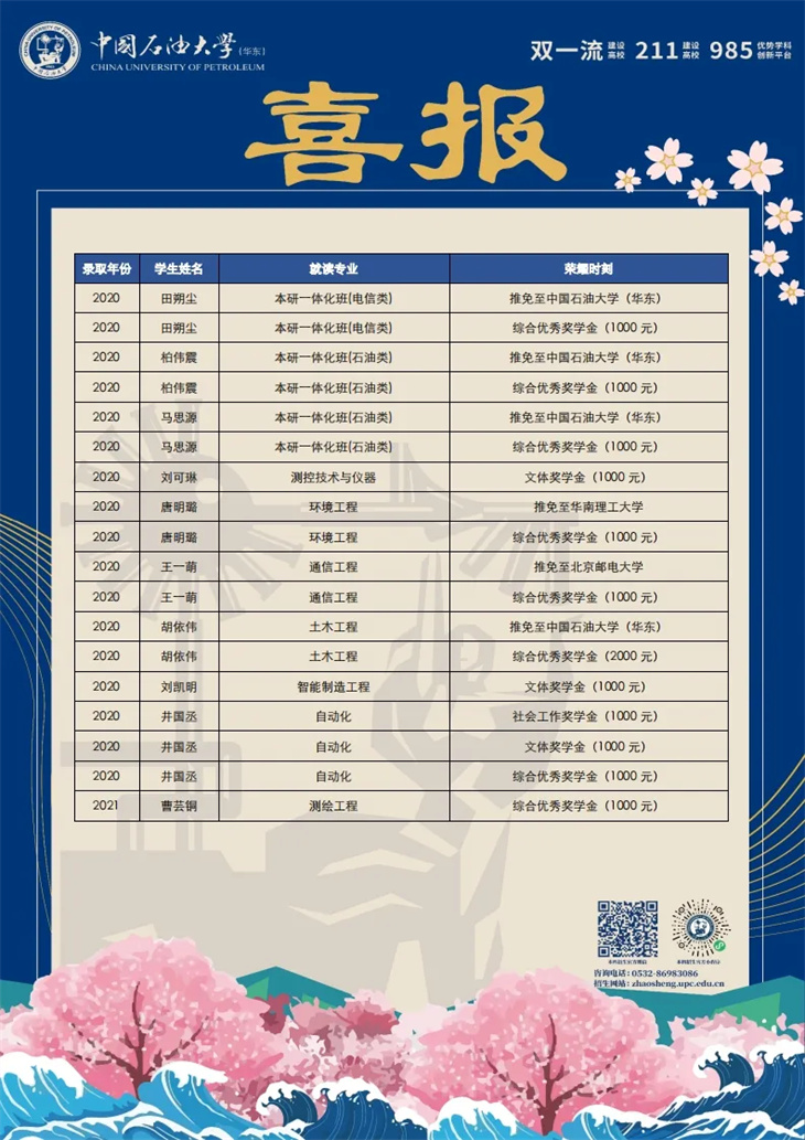近日,中国石油大学向我校发来喜报,感谢我校多年来为中国石油大学输送大量品学兼优的杰出毕业生。为表彰和奖励在德、智、体、美、劳等方面全面发展的优秀学生,中国石油大学将我校学子部分获奖和推免情况表彰如下: