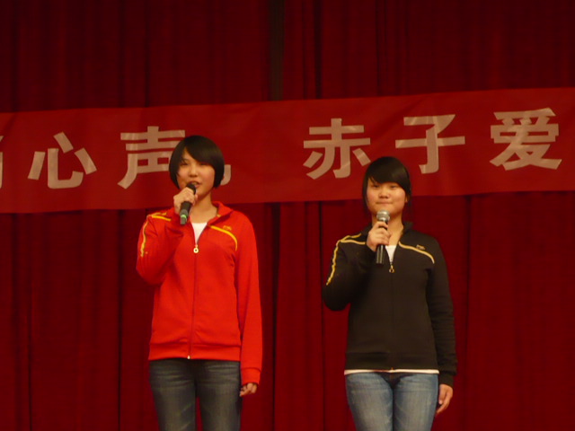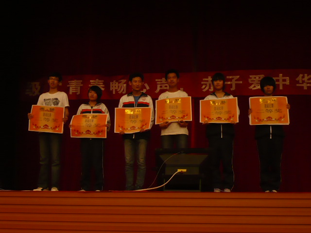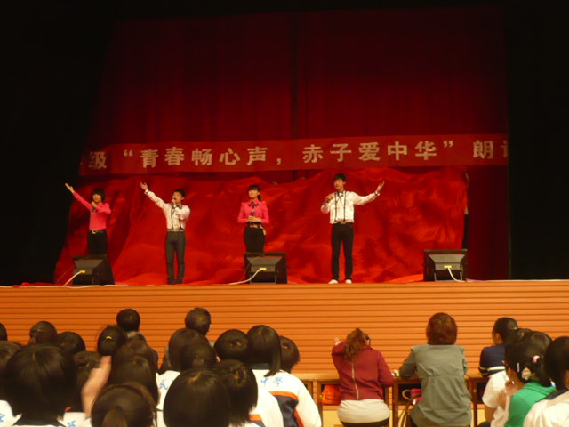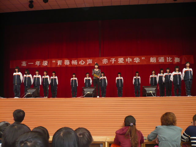 在学校领导的关怀下,在高一年级部的精心筹备、各班主任积极组织与学生的热情参与下,2012年4月28日下午,高一年级全体学生齐聚体育馆,成功举行了一场以“青春畅心声,赤子爱中华”为主题的朗诵比赛。