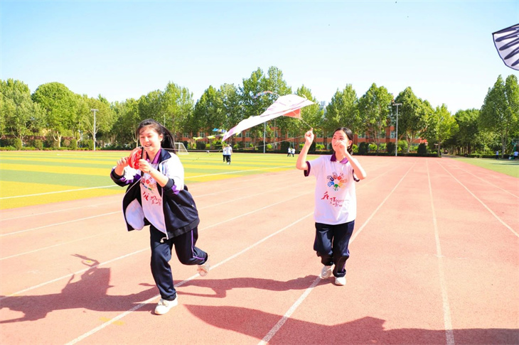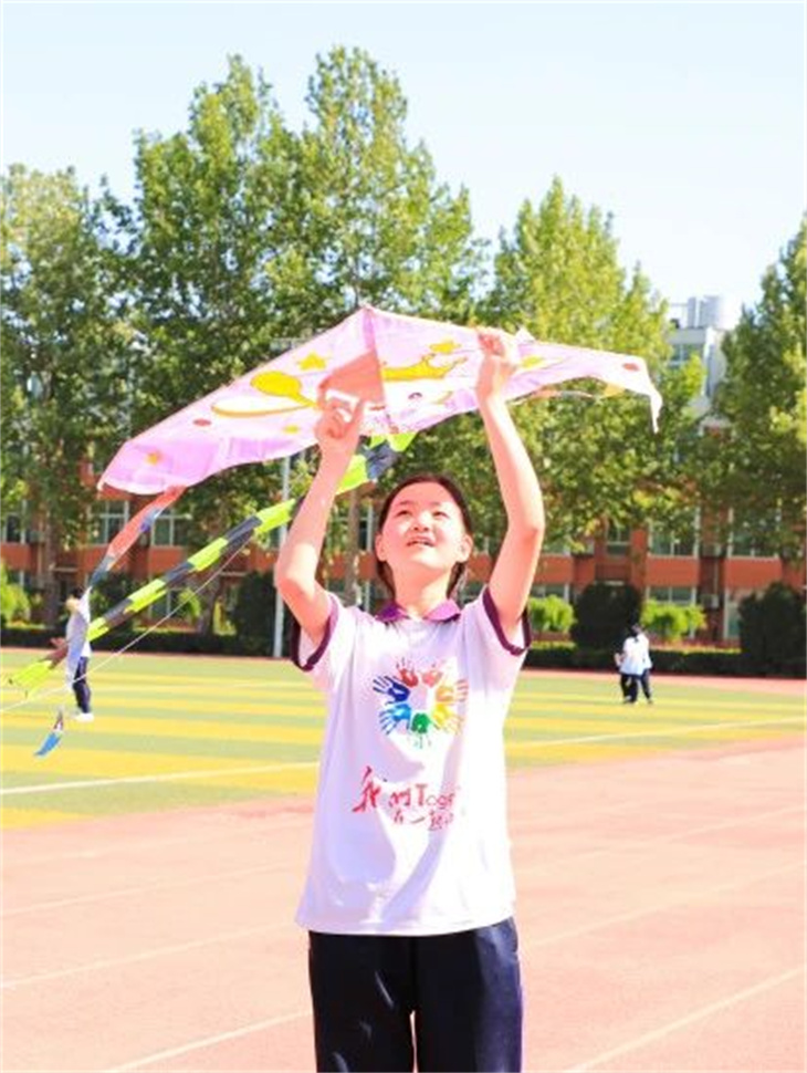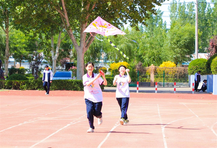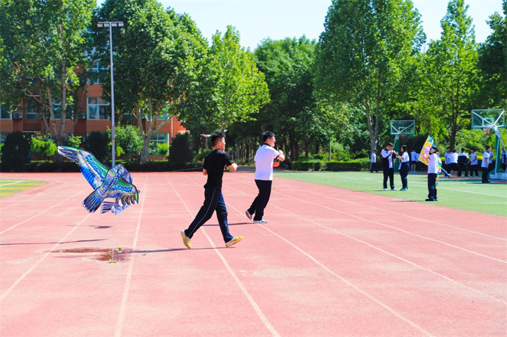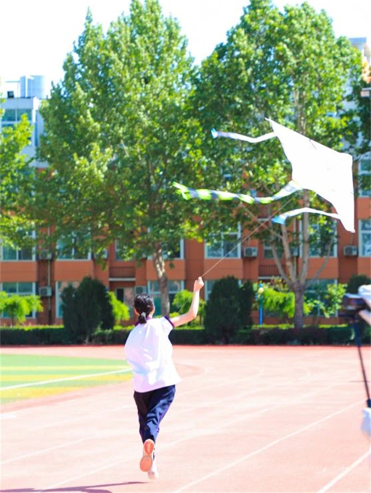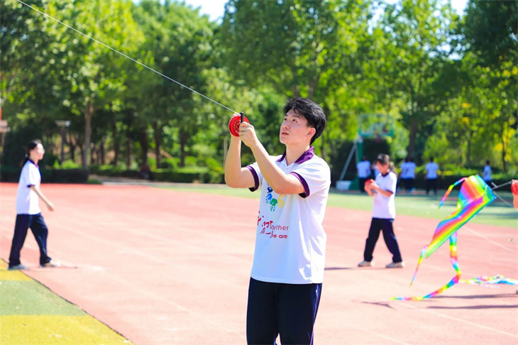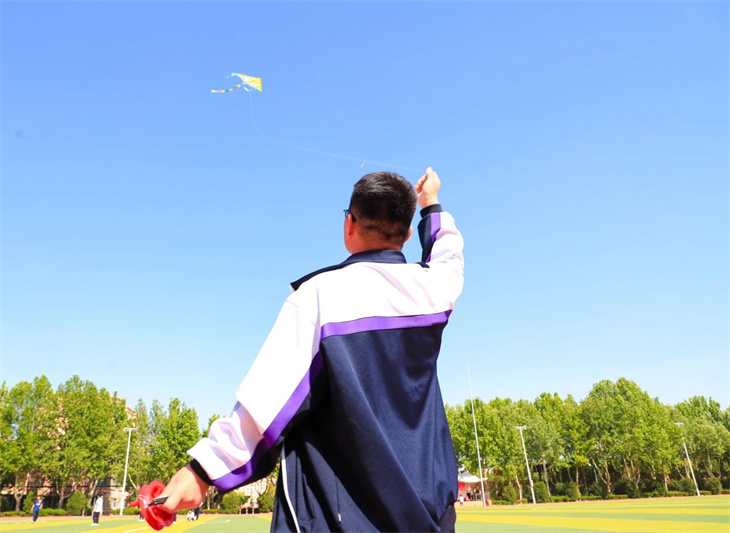 抬头看,“碧草涌波澜,白云追纸鸢”。一只只精美艳丽的风筝,在同学们时而拉线放线、时而前后轻抖中,乘风而上、迎风飞翔。飘舞的风筝承载着同学们的美好心愿迎风招展。绿茵场上处处可见同学们的尽情奔跑,亦处处洋溢着同学们的欢乐畅笑。