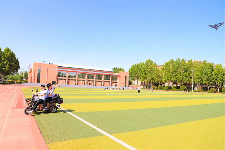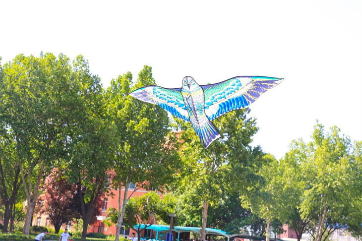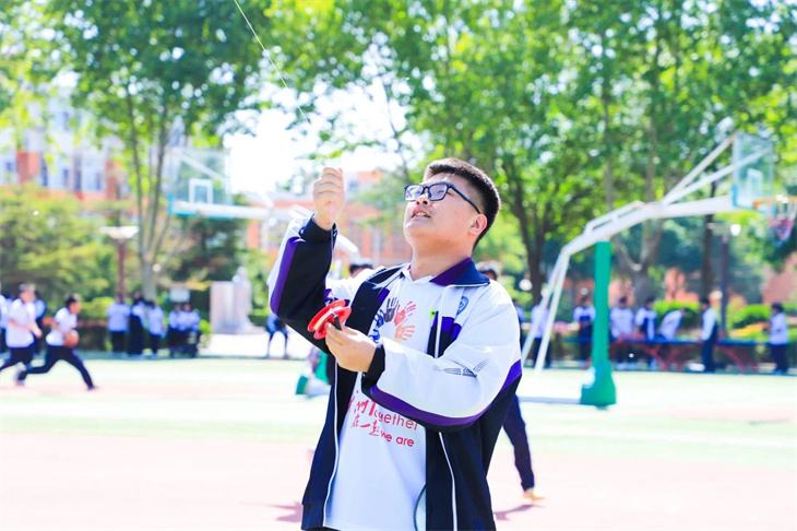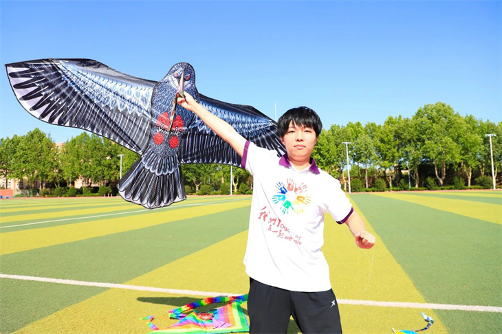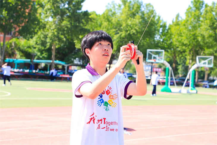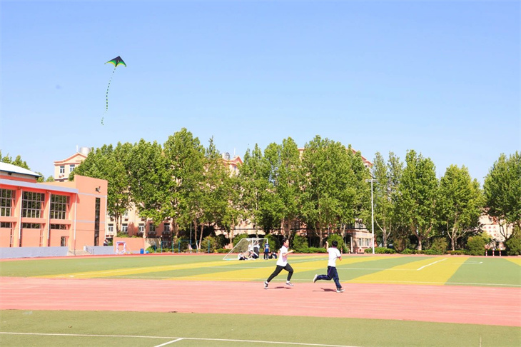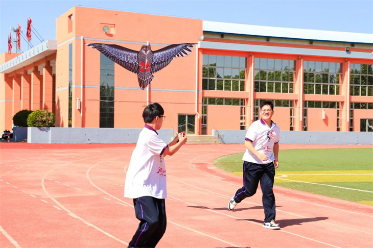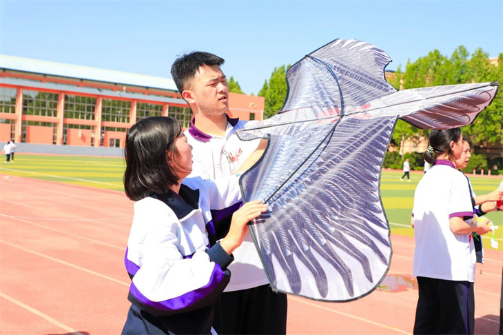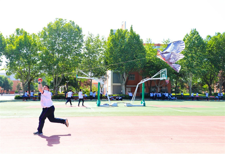 抬头看,“碧草涌波澜,白云追纸鸢”。一只只精美艳丽的风筝,在同学们时而拉线放线、时而前后轻抖中,乘风而上、迎风飞翔。飘舞的风筝承载着同学们的美好心愿迎风招展。绿茵场上处处可见同学们的尽情奔跑,亦处处洋溢着同学们的欢乐畅笑。