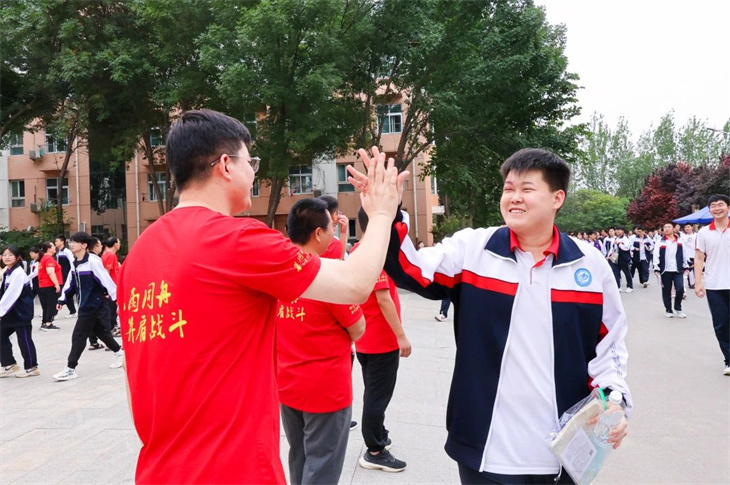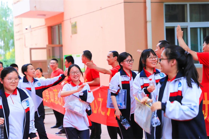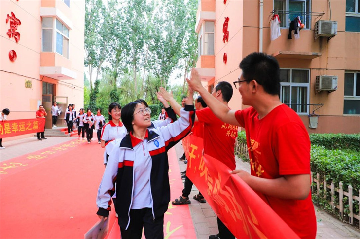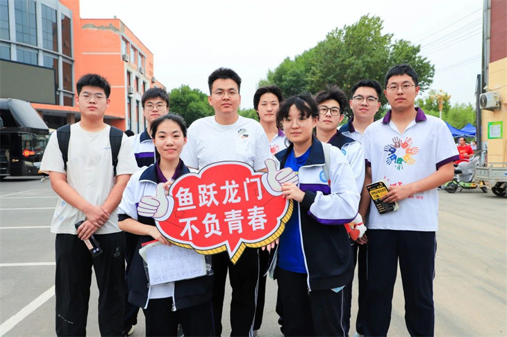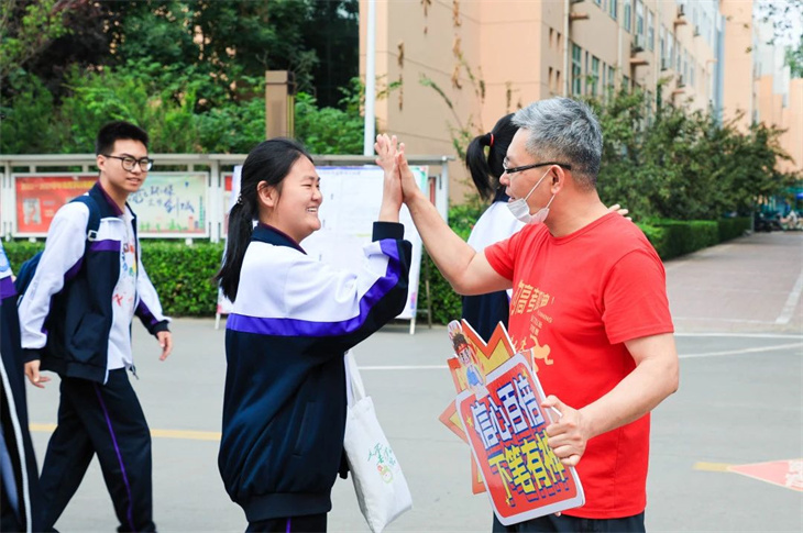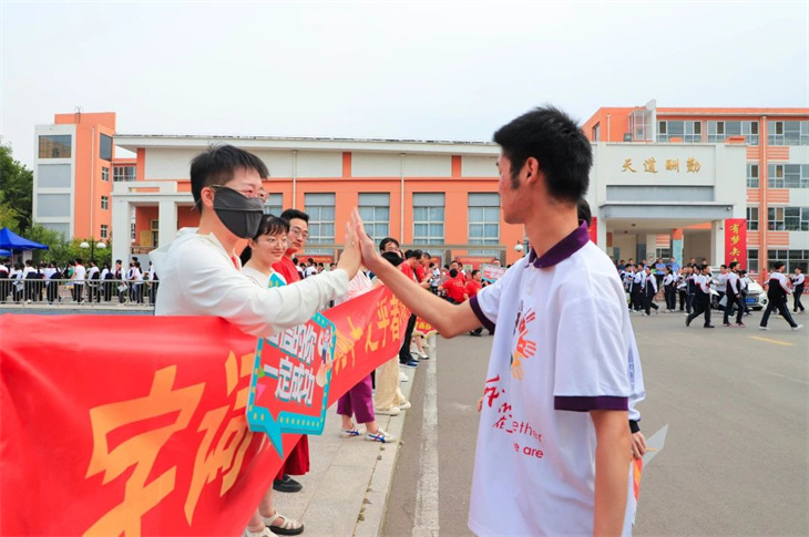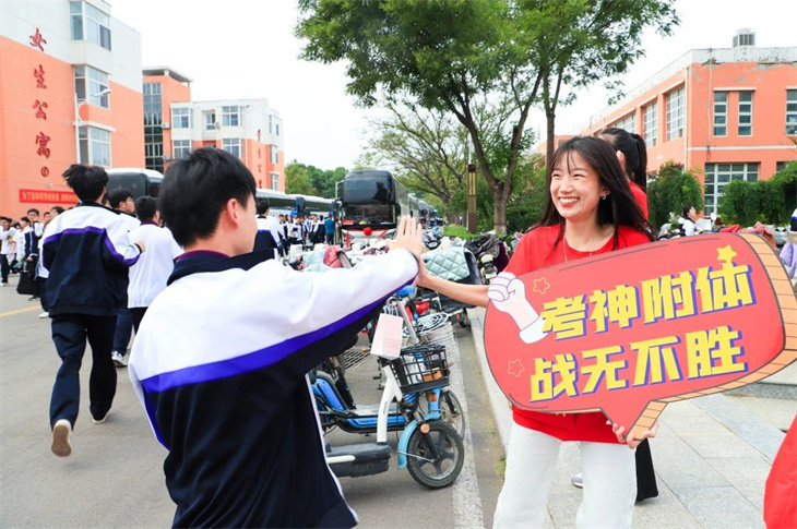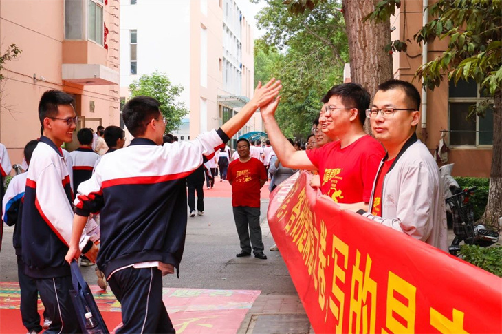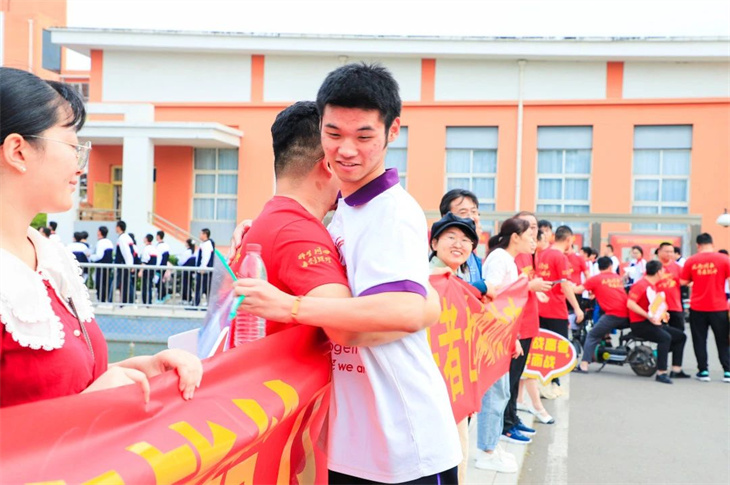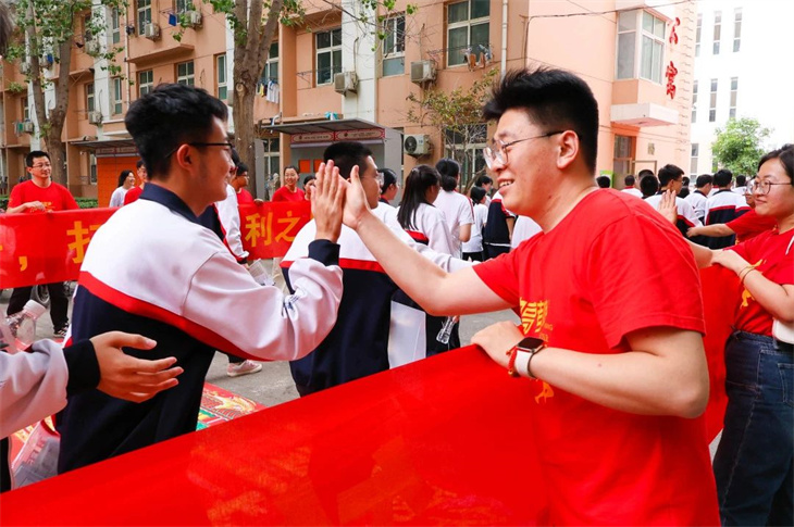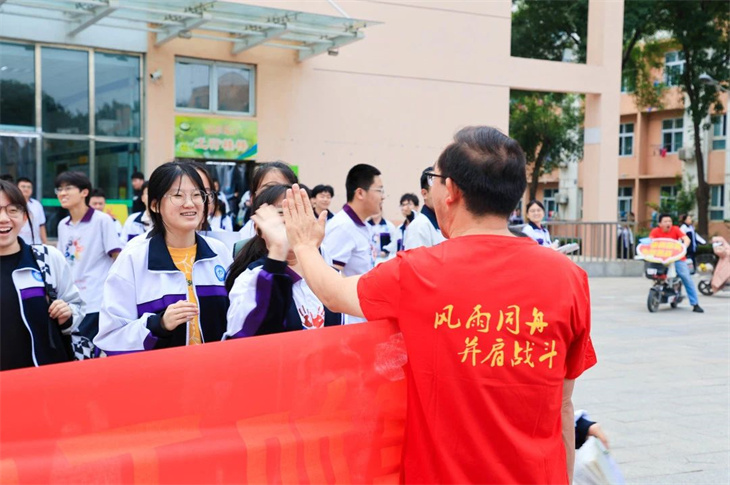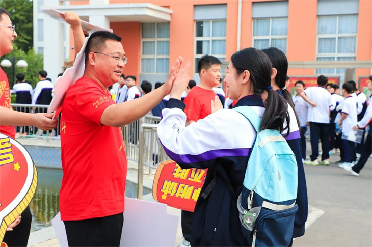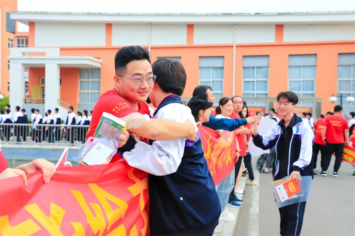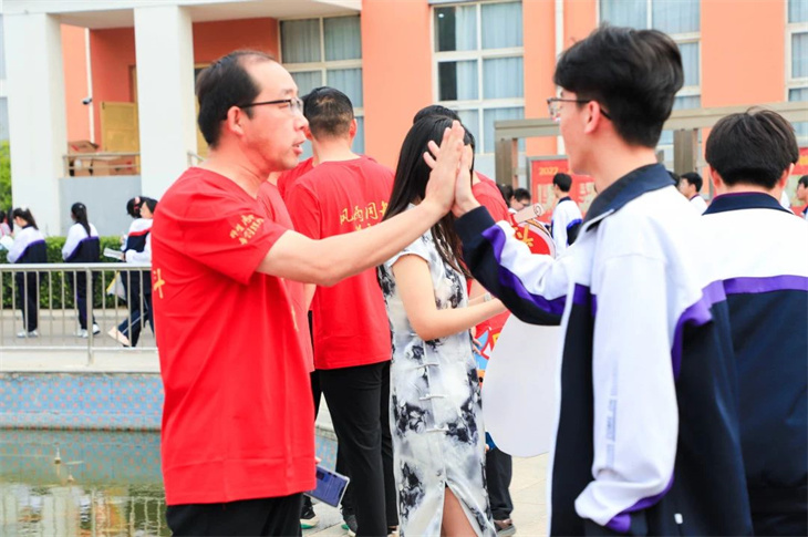 考场外,老师们身穿红衣或旗袍,手拿激励横幅,为同学们加油打气。同学们与老师们热切拥抱、激情击掌、握拳加油,和着老师的叮咛与嘱咐,带着真挚的祝福与期许安心开赴。逐梦同行,老师永远是同学们坚实的后盾!
