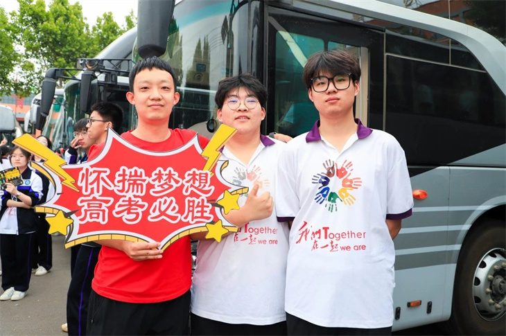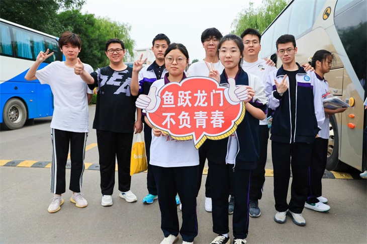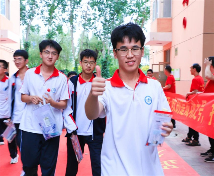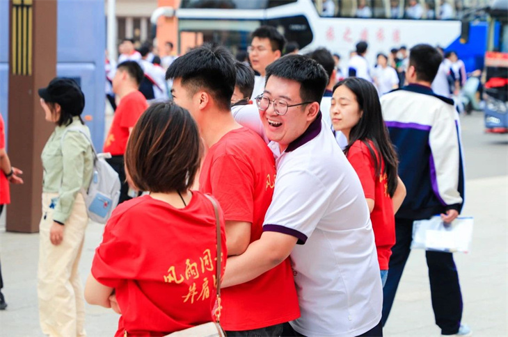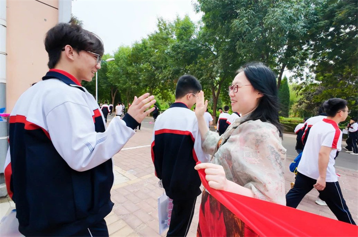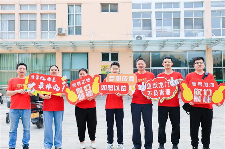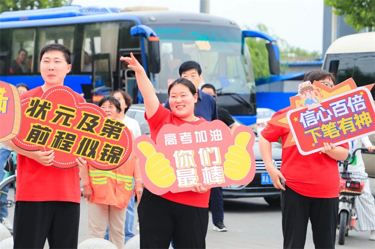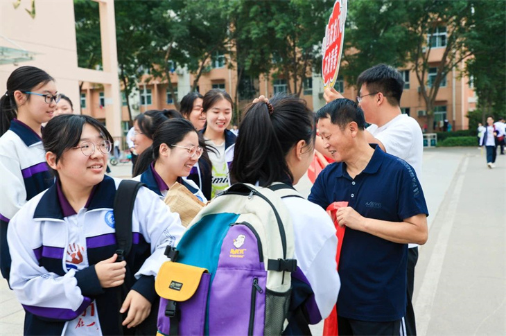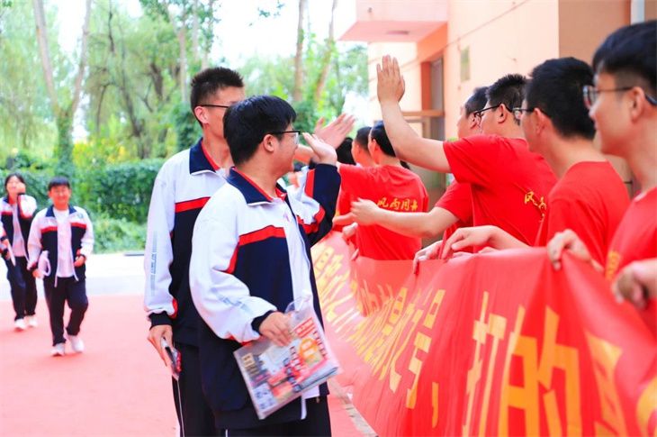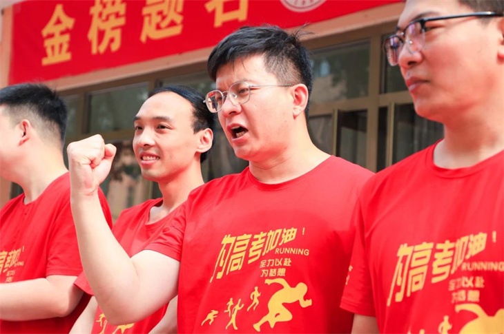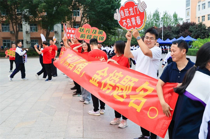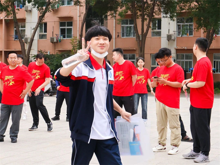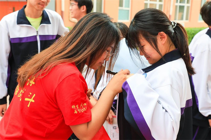 考场外,老师们身穿红衣或旗袍,手拿激励横幅,为同学们加油打气。同学们与老师们热切拥抱、激情击掌、握拳加油,和着老师的叮咛与嘱咐,带着真挚的祝福与期许安心开赴。逐梦同行,老师永远是同学们坚实的后盾!