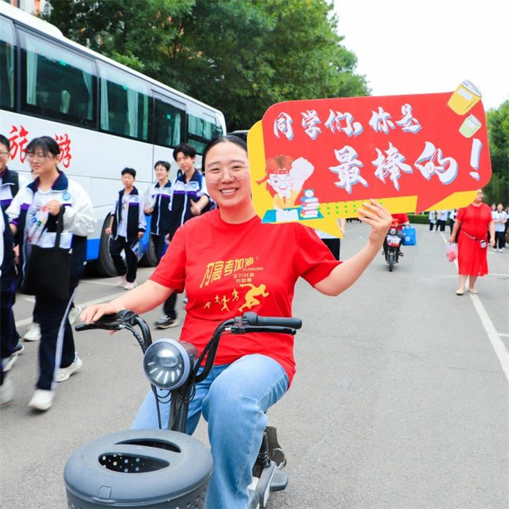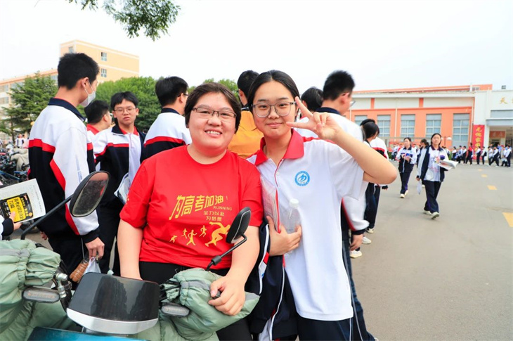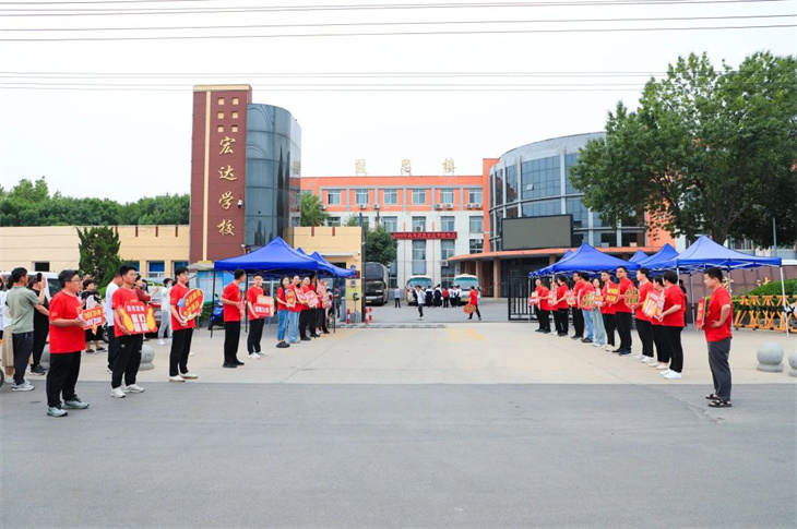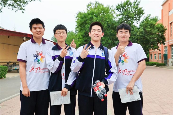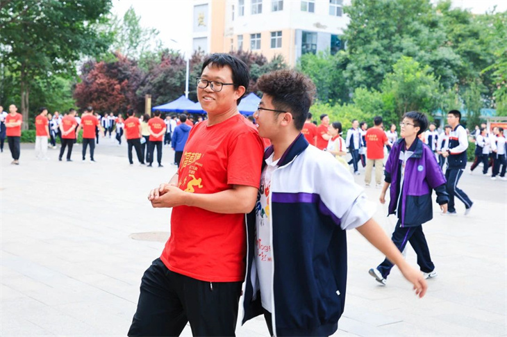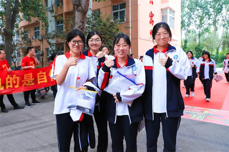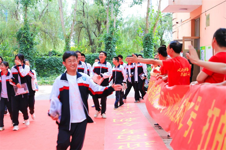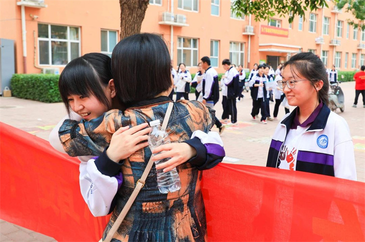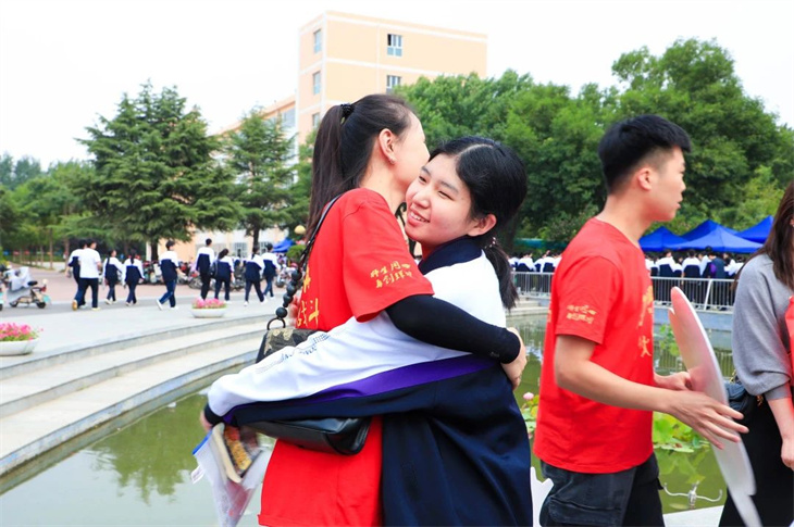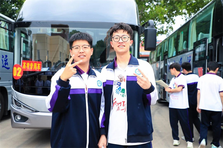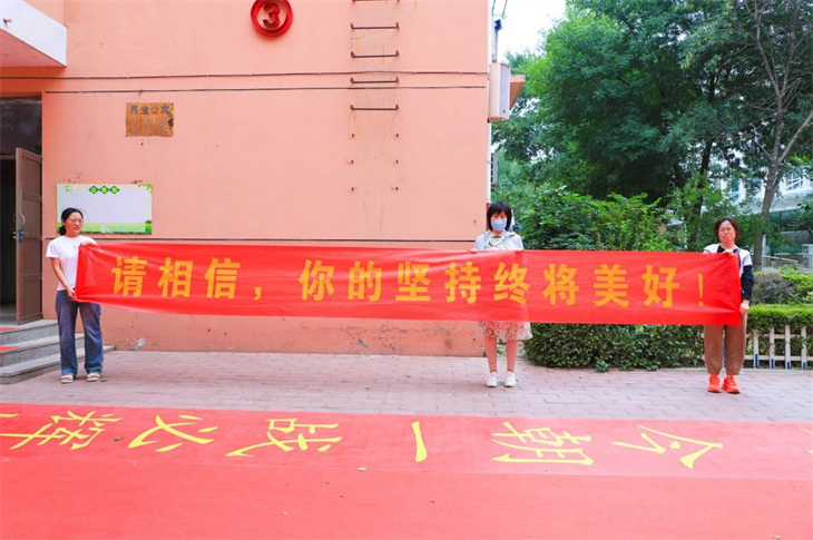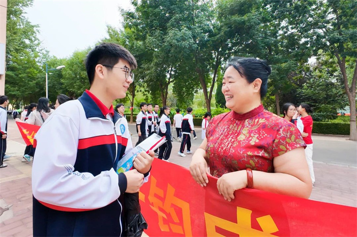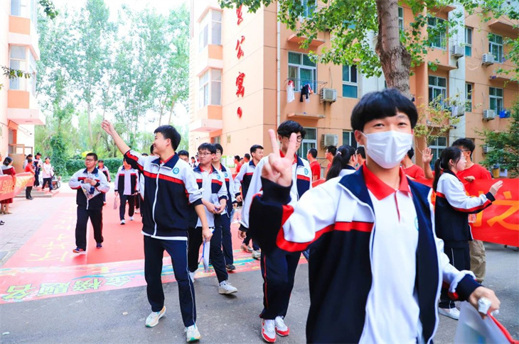 考场外,老师们身穿红衣或旗袍,手拿激励横幅,为同学们加油打气。同学们与老师们热切拥抱、激情击掌、握拳加油,和着老师的叮咛与嘱咐,带着真挚的祝福与期许安心开赴。逐梦同行,老师永远是同学们坚实的后盾!