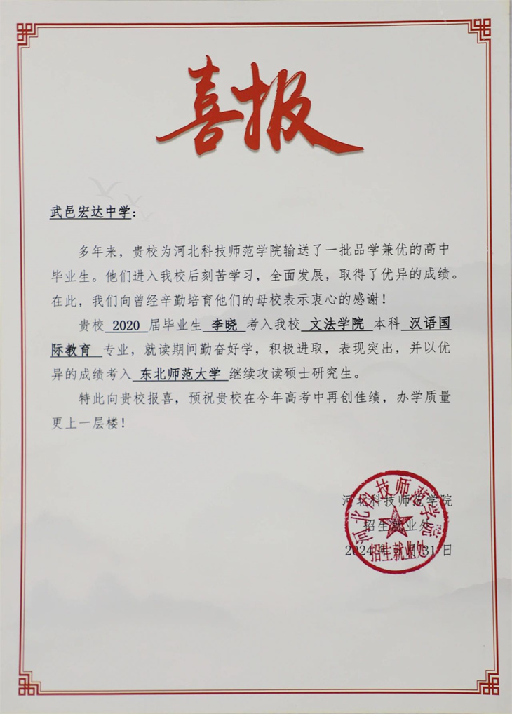 近日,河北科技师范学院向我校发来喜报,祝贺我校优秀毕业生李晓同学成功考入东北师范大学硕士研究生。