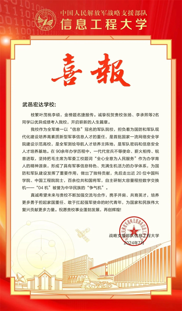 宏达喜报——中国人民解放军战略支援部队信息工程大学向我校发来喜报