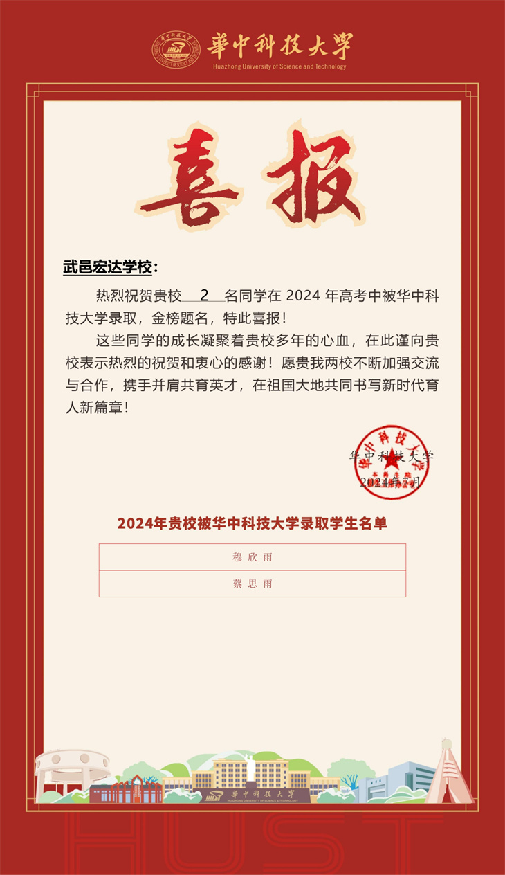 在今年的高考中,我校穆欣雨、蔡思雨等2名优秀毕业生被华中科技大学录取,金榜题名,华中科技大学特向我校发来喜报!