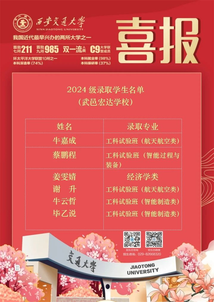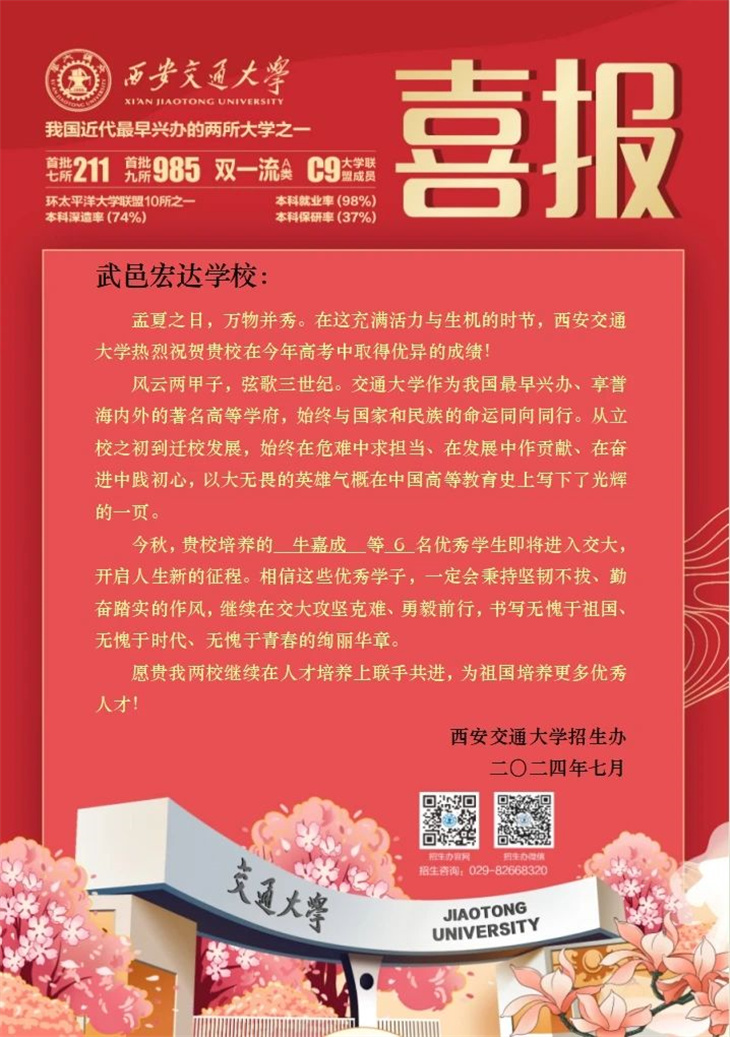 孟夏之日,万物并秀。在今年的高考中,我校牛嘉成、蔡鹏程、姜雯婧、谢升、牛云哲、毕乙说等6名优秀毕业生考入交大,即将开启人生新的征程。西安交通大学向我校发来喜报表示祝贺。