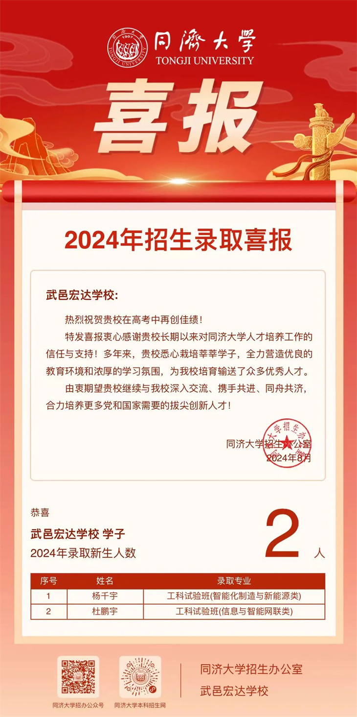 在今年的高考中,我校杨千宇、杜鹏宇等2名优秀毕业生成功考入同济大学,同济大学特向我校发来喜报表示祝贺,并期望与我校继续深入交流、携手共进、同舟共济合力培养更多党和国家需要的拔尖创新人才!