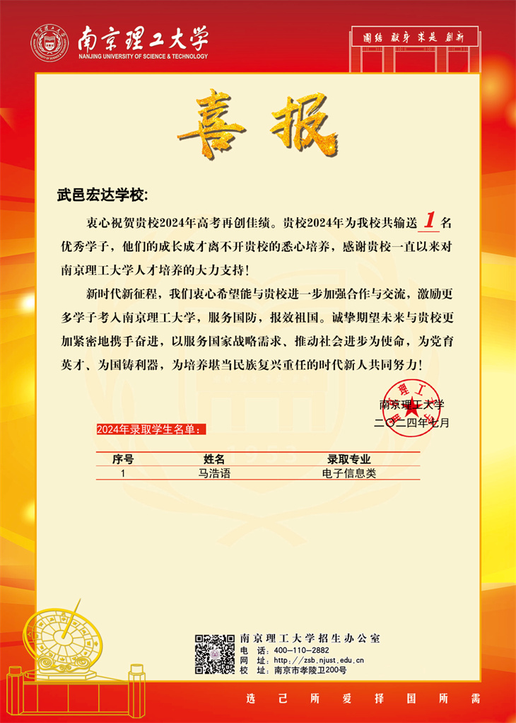 新时代新征程,在今年的高考中,我校优秀毕业生马浩语同学成功考入南京理工大学,南京理工大学特向我校发来喜报表示祝贺。