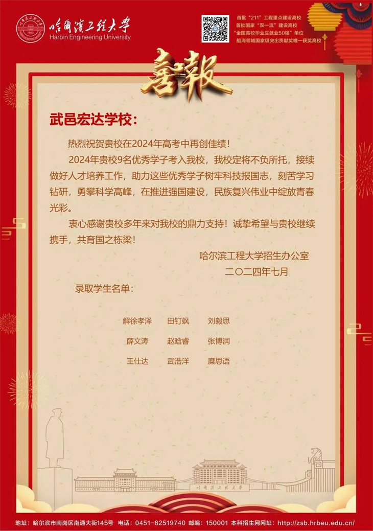 在今年的高考中,我校解徐孝泽、田钉飒、刘毅思、薛文涛、赵晗睿、张博润、王仕达、武浩洋、糜思语等9名优秀毕业生成功考入哈尔滨工程大学,哈工大特向我校发来喜报表示祝贺,并表示定会接续做好人才培养工作,助力这些优秀学子树牢科技报国志,刻苦学习钻研,勇攀科学高峰,在推进强国建设,民族复兴伟业中绽放青春光彩!