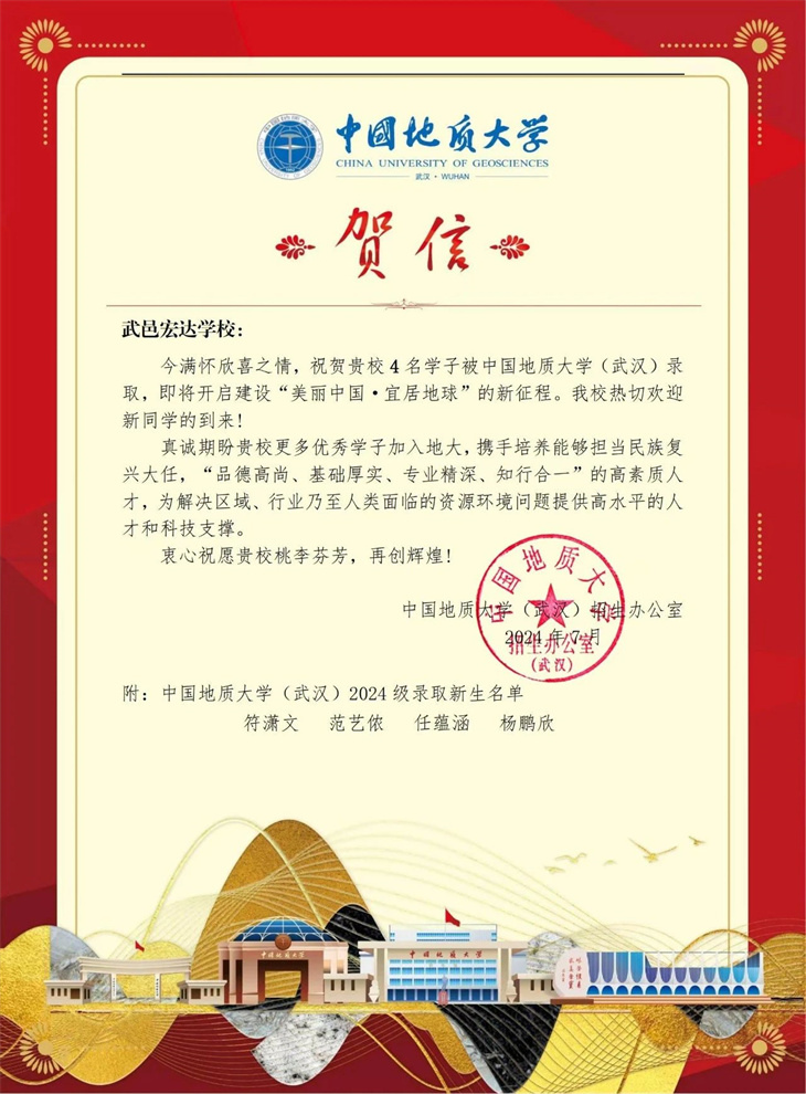 在今年的高考中,我校符潇文、范艺侬、任蕴涵、杨鹏欣等4名优秀毕业生成功考入中国地质大学,即将开启建设“美丽中国·宜居地球”的新征程。中国地质大学向我校发来喜报表示祝贺。
