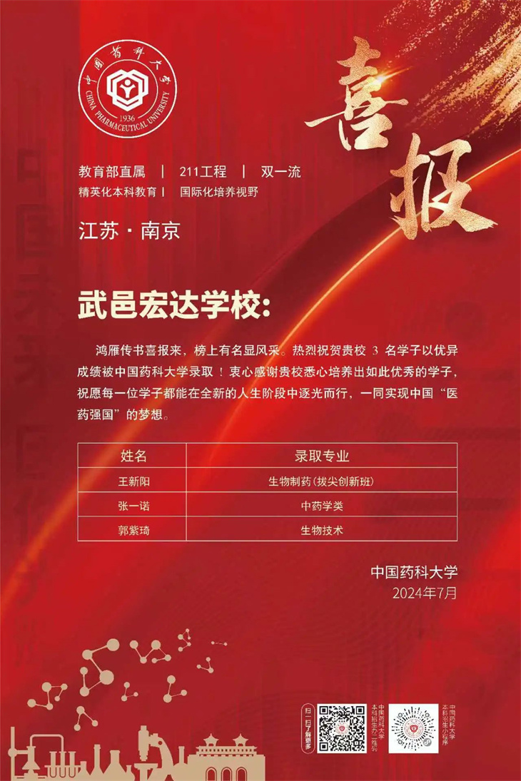 鸿雁传书喜报来,榜上有名显风采。在今年的高考中,我校王新阳、张一诺、郭紫琦等3名优秀毕业生成功考入中国药科大学,中国药科大学特向我校发来喜报表示祝贺,并祝愿每一位学子都能在全新的人生阶段中逐光而行,一同实现中国“医药强国”的梦想!