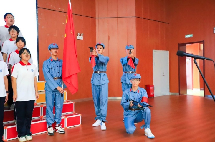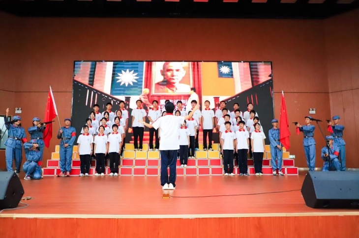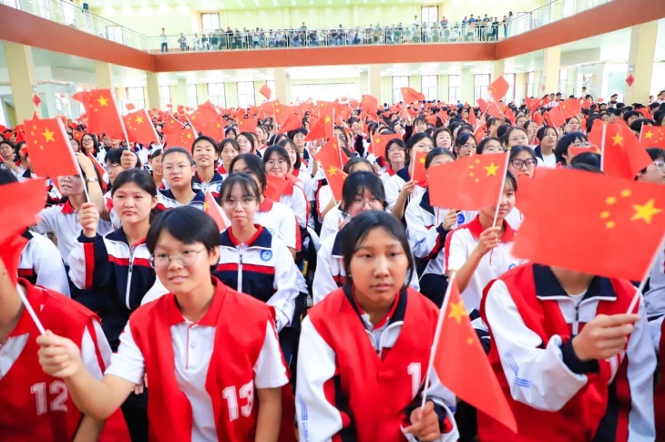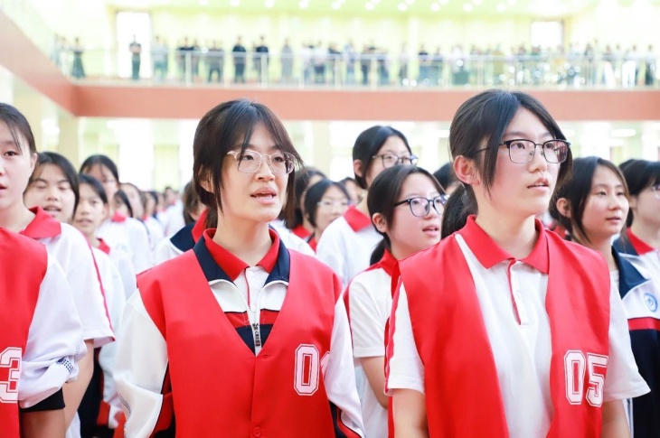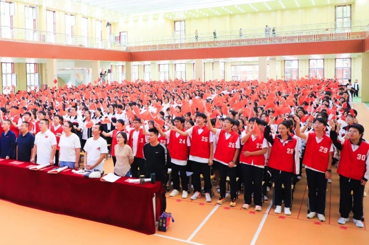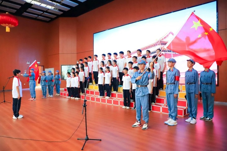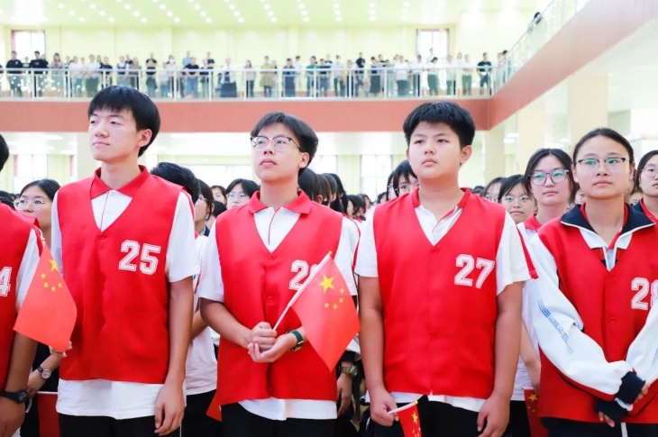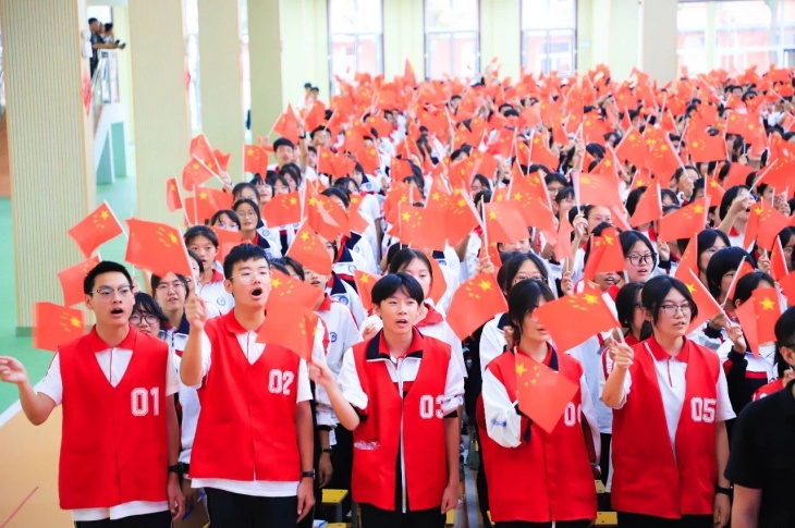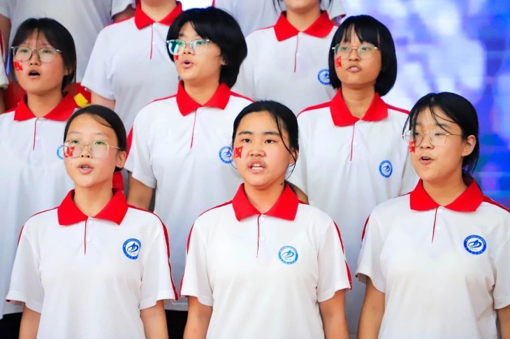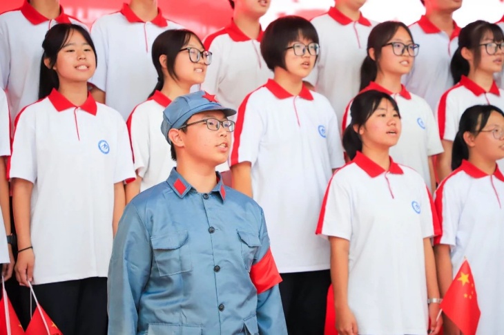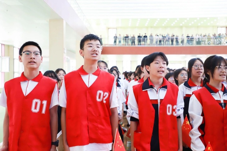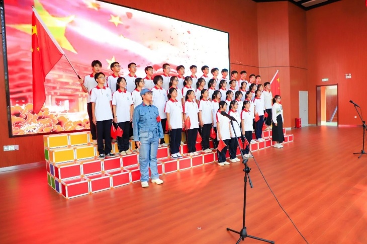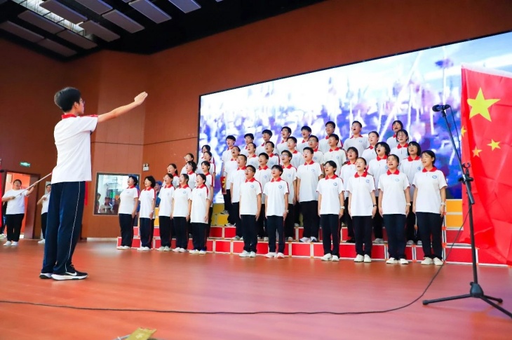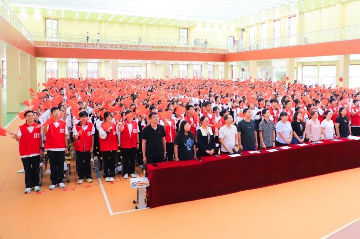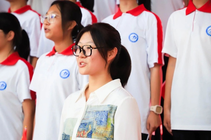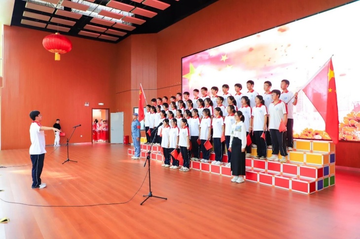 同擎一面旗,共唱一首歌。全体师生擎旗庄严肃立,齐唱《义勇军进行曲》,国歌嘹亮,奏响中华民族的豪迈乐章。