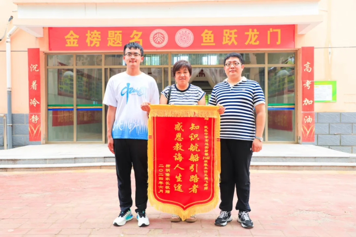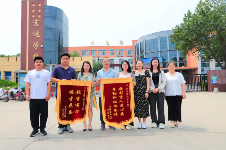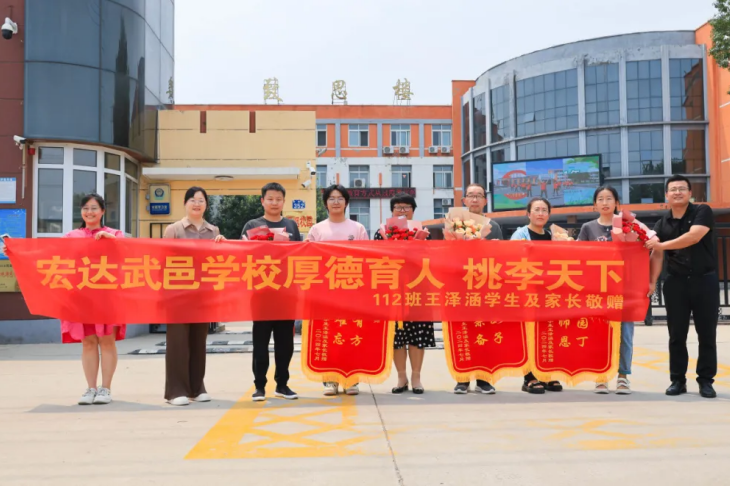 8月7日上午,我校毕业学子柳明儒及其家长来到武邑宏达学校,将写有“知识航船引路者 感恩教诲人生途”、“辛勤耕耘育桃李 呕心沥血培精英”字样的两面锦旗送到了2102班班主任王鹏飞老师及2102班任课老师手中,以此表达对老师们和学校的教育之恩和培育之情。