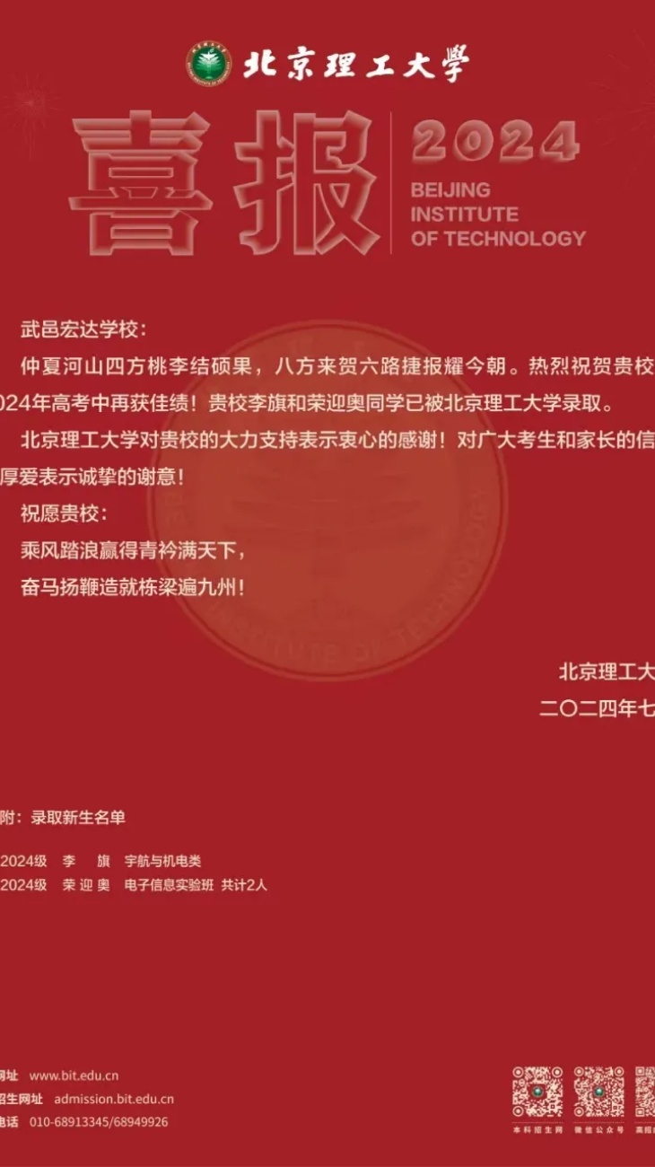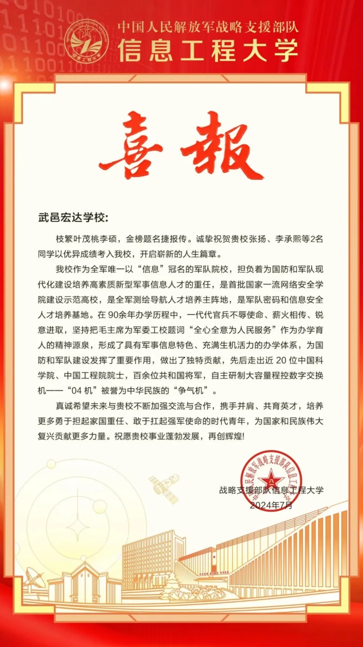 7月,中国人民解放军空军招飞局北京选拔中心、中国人民解放军战略支援部队信息工程大学等知名高校纷纷向我校发来喜报,祝贺我校学子以优异成绩考入大学,大学高中携手奋进,共育堪当民族复兴重任的时代新人。