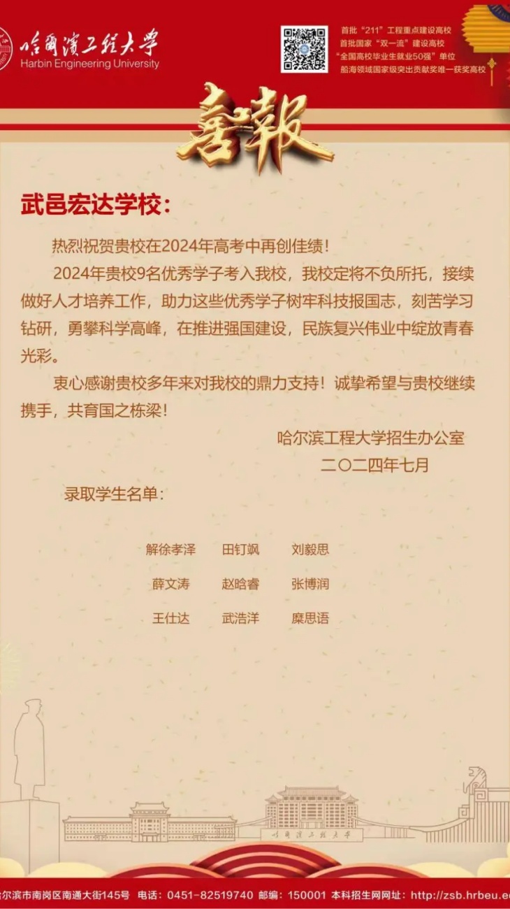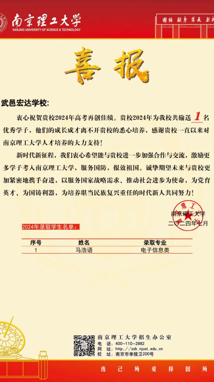 近日,华中科技大学、西安交通大学、同济大学、南京理工大学、哈尔滨工程大学、中国地质大学、中国药科大学、北京理工大学、南京师范大学、东北大学、吉林大学、上海交通大学、武汉大学、中国科学技术大学、中国石油大学(华东)等15所著名高校分别向我校发来喜报,祝贺我校学子被高校录取。这不仅是对学生们多年刻苦学习的最好认可,也是对我校教育质量的有力证明。