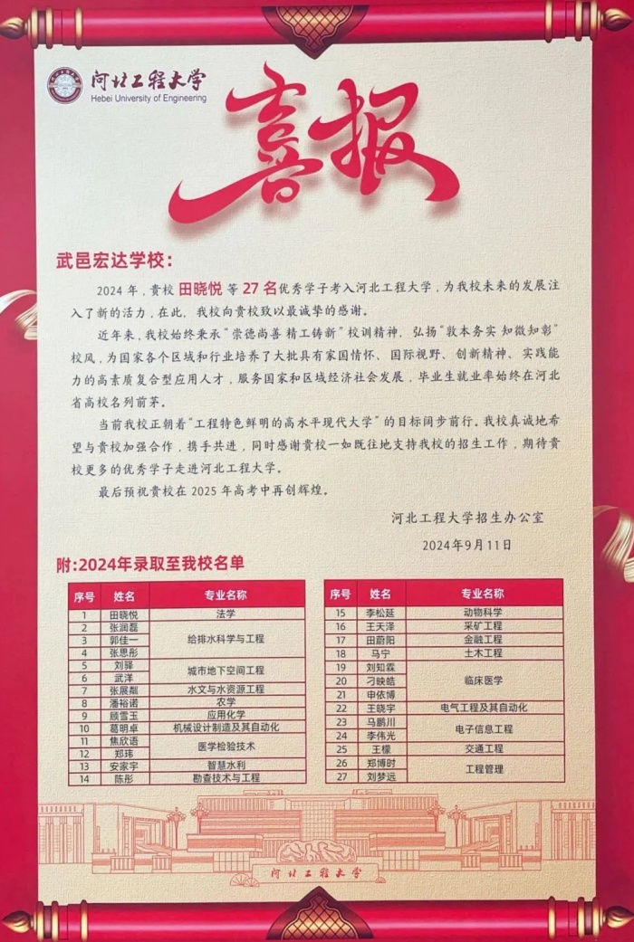 贺!我校27名学生被河北工程大学录取