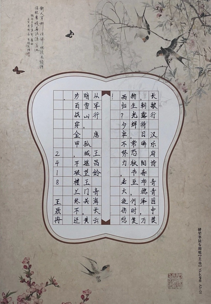 书法作品是中华民族传统文化的瑰宝,在这里尽显风姿。楷书作品,笔画规整,犹如端庄的君子,一笔一划间透着严谨与端庄;行书作品则行云流水,似灵动的舞者,在纸间自由穿梭,展现出潇洒飘逸之态。毛笔字和硬笔书法的交叉展示,充分展现了宏达学子的多才多艺。