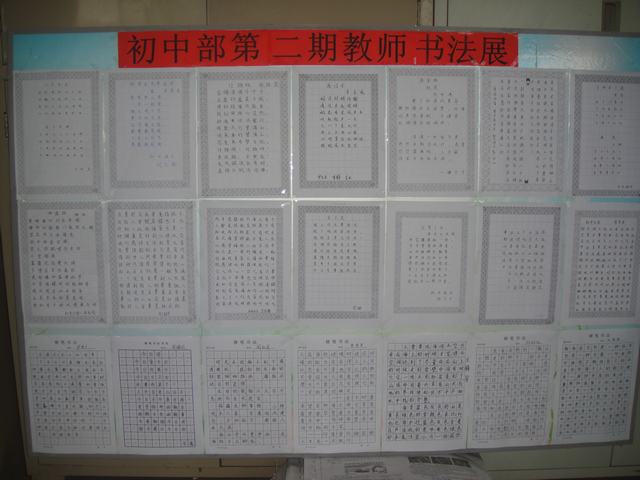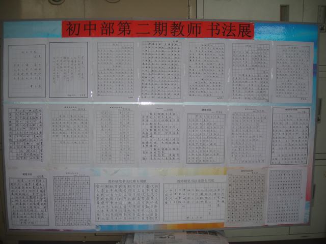 为丰富广大教职工的业余文化生活,促进广大教师书写能力的不断提高,我校于2014年5月组织了第二次全体教师硬笔书法展示活动。活动中每个老师都认真地书写,力求发挥自己的最佳水平。上交的作品字体多样,各具特色,形神兼备,楷书端正整洁,行书飘逸潇洒,隶书秀美圆润,蕴含了我校教师对书法的热爱及娴熟的书法技艺。本次活动不仅为全体教师创设了书法学习交流的平台,也给校园平添了一股浓郁的翰墨香味。