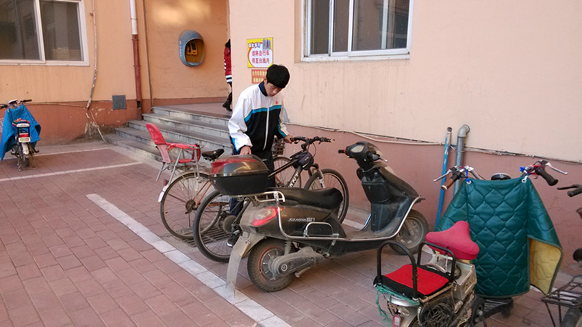 高二年级部安排专人,每天及时做好自行车的排放工作。学生们把没按要求排放的自行车放入规定区域。自行车车头、车尾统一在一条线上,既方便进出,又整齐美观;普通自行车与电动自行车分别排放,整齐划一。