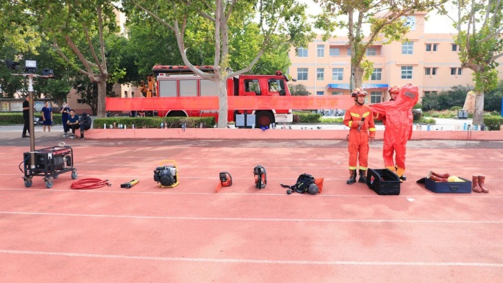 活动伊始,消防救援队的专业人员,向同学们展示了一系列消防器材,逐一介绍了器材的名称、用途和使用方法,并热情地邀请同学们亲自体验。同学们热情高涨,积极尝试,在消防员的指导下,真正实现了“零接触、深体验、细感受”,过足了一把“消防员瘾”。通过亲自体验,同学们纷纷表示消防设备非常有重量,感受到了消防员的不易,向与时间赛跑、为生命护航的消防官兵致敬!