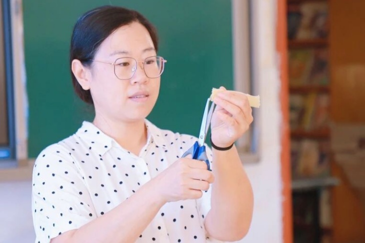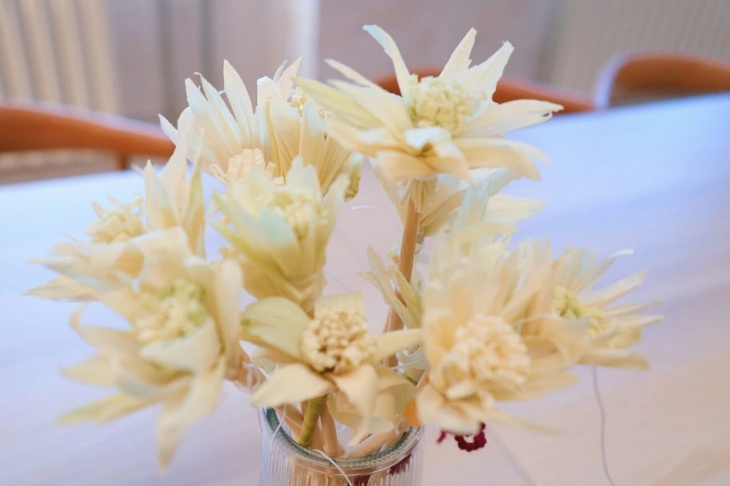 "金老师,我的花瓣总卷不自然!"面对学生皱巴巴的"玉米皮团",金老师弯下身子,握住学生的手:"注意力度,像剥香蕉皮那样轻推。"她灵巧的手将卷边、粘贴、定型的步骤拆解得极细——从选的玉米皮避免断裂,到用木棍辅助固定花瓣角度,每个细节都详细示范。