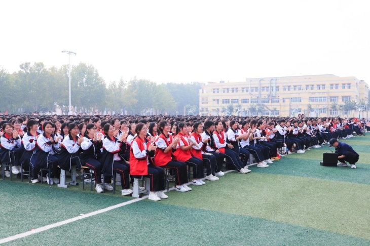 在热烈的掌声中,学校副校长金耀辉同志登台为本次运动会致闭幕词。领导首先向在赛场上挥洒汗水的运动员、公正裁决的裁判员以及辛勤付出的工作人员表示衷心的感谢。本届运动会恰逢国庆,体育精神与爱国情怀在此刻交汇融合,这次特别的国庆经历将成为宏达学子高中生活中难忘的一页。他指出运动场上的胜负是暂时的,但拼搏进取的精神是永恒的,少年的奋斗,就是献给祖国最好的生日礼物,希望同学们以更强健的体魄、更昂扬的斗志,去迎接未来的挑战,书写青春灿烂的篇章。