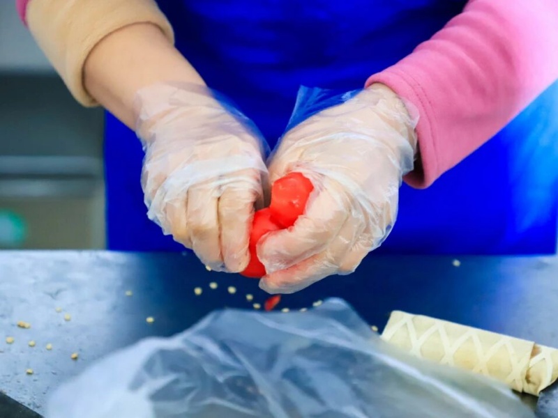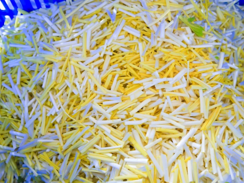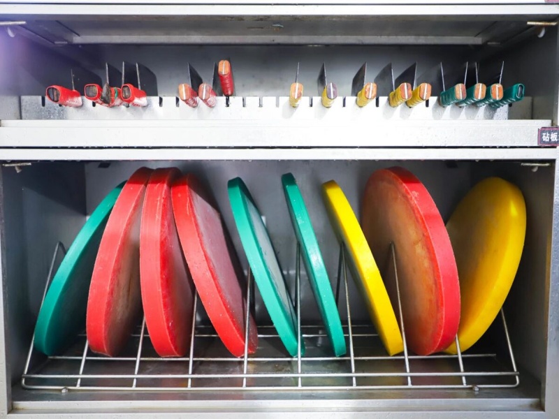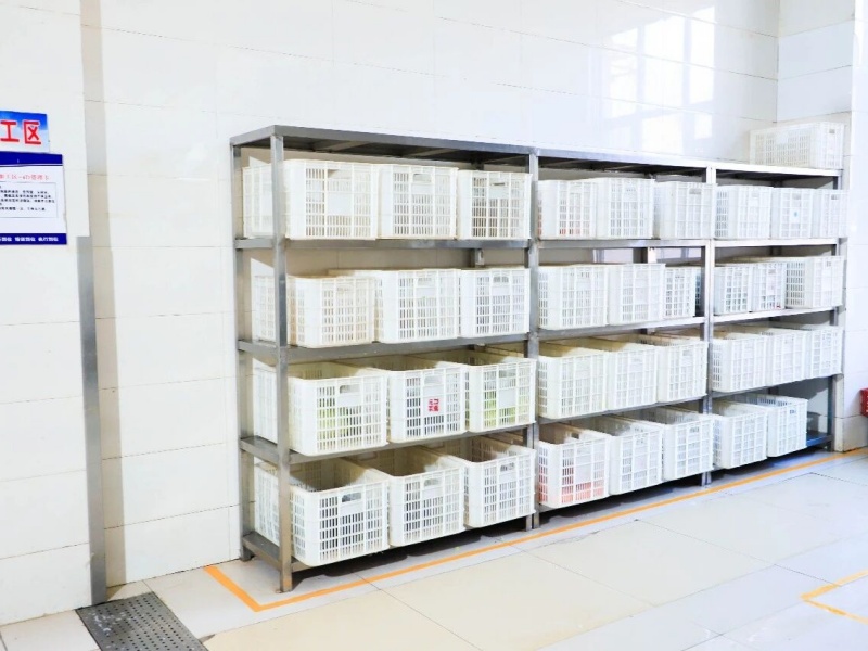 食材的入库出库十分迅速,很快,就来到了预处理环节,粗加工间实施生熟、荤素分离,历经浸泡、清洗等多重清洁流程,再由不同的区域,刀具、案板严格的色标管理分区处理,当日菜单所需的每一种食材,都被分装放置在对应颜色的食品框内。