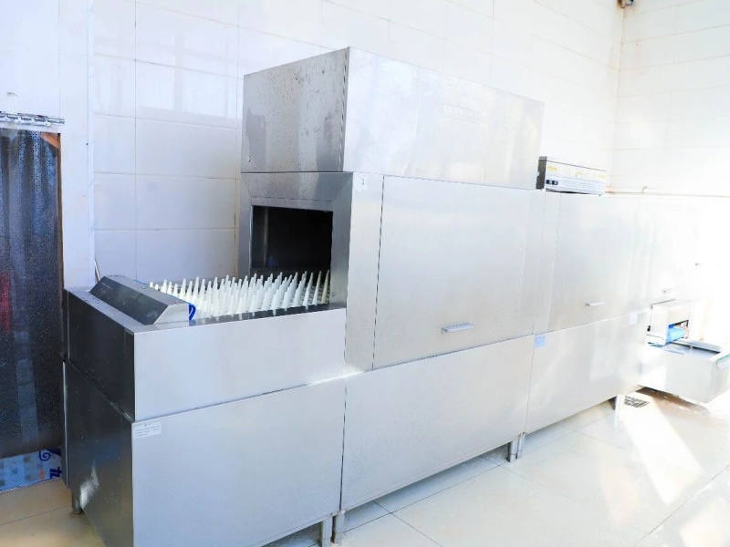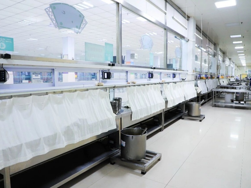 餐后的清洁,细致到每一个角落。洗筷机、洗碗机及时地清洗餐具,与高温消毒室共同进行双重消毒措施,保持着餐具的干净卫生。非操作时间,一排排的紫外线消毒灯自动开启,在餐厅的所有区域寂静工作。清洁消毒,又完成一次负责任的循环。