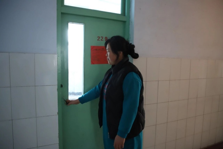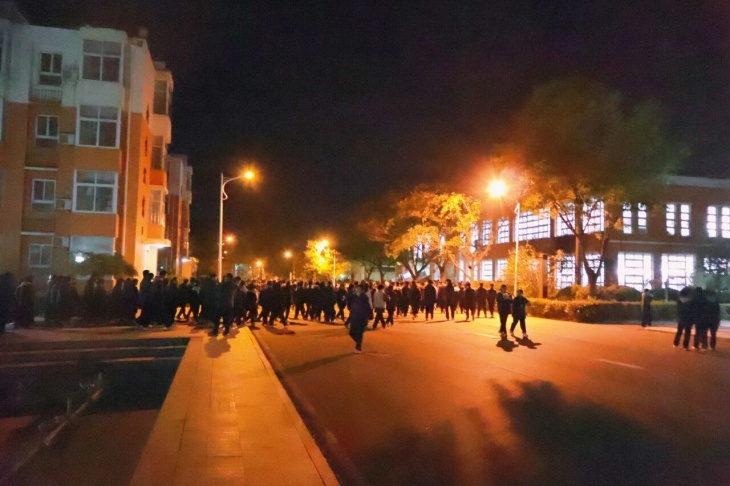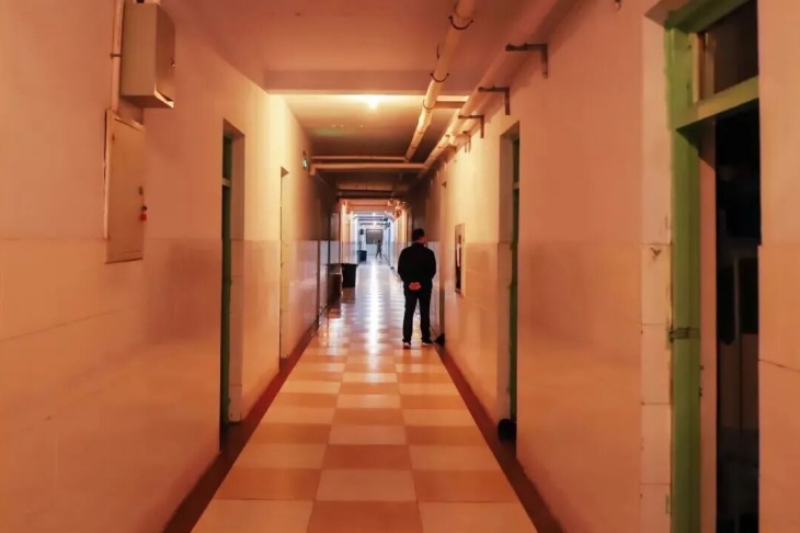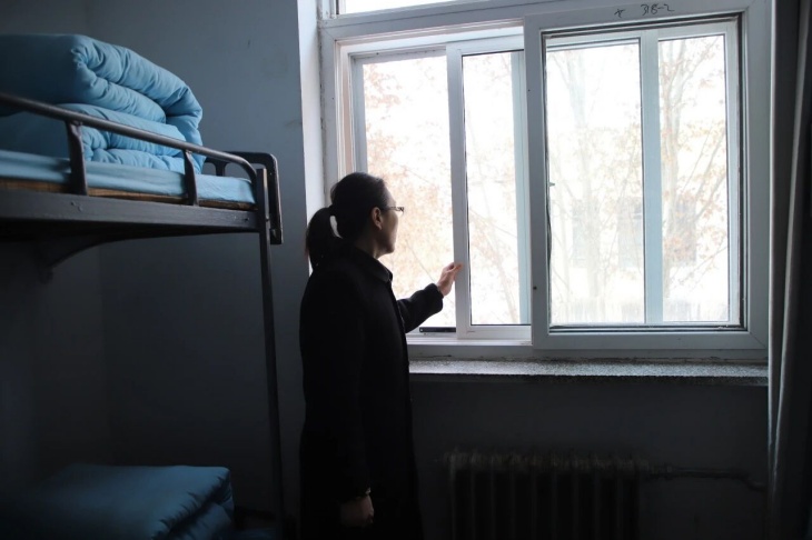 宿舍楼里,生活老师打着手电查寝,