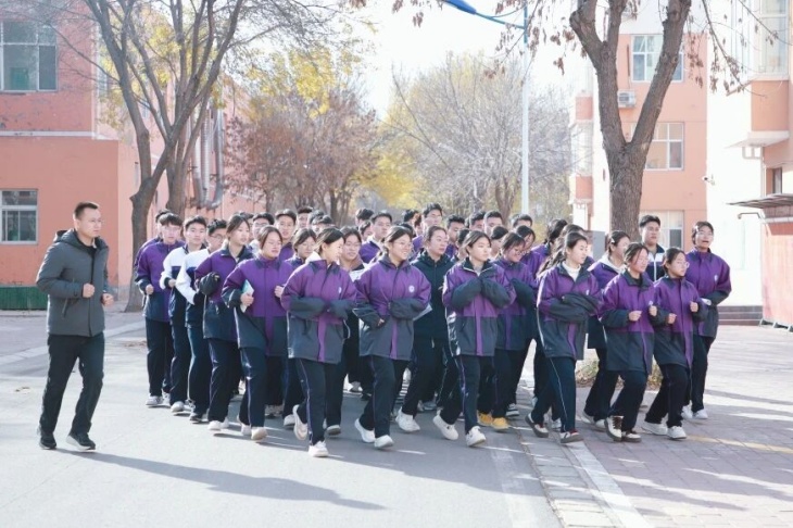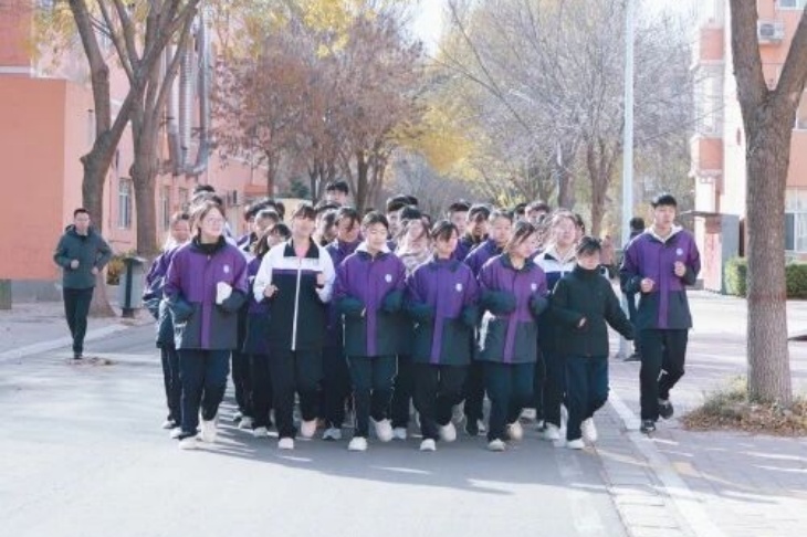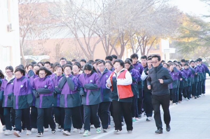 操场上,班主任老师陪着晨跑的身影,