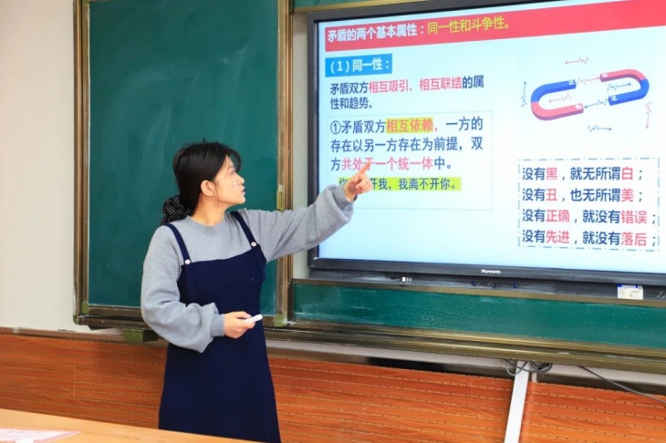 政治学科中,青年教师们紧扣新课标要求,将抽象的理论知识与社会热点、发展变迁、日常生活紧密结合,矛盾的对立统一、逻辑的演绎推理、仲裁诉讼的法律知识……让思政课堂兼具理论深度与实用价值。