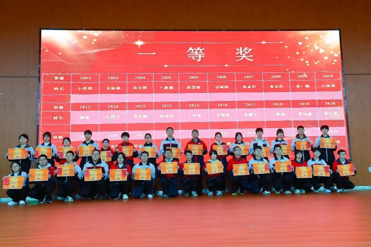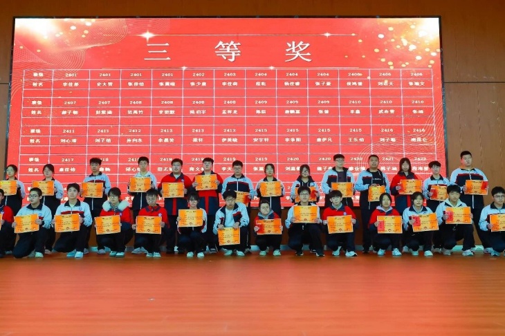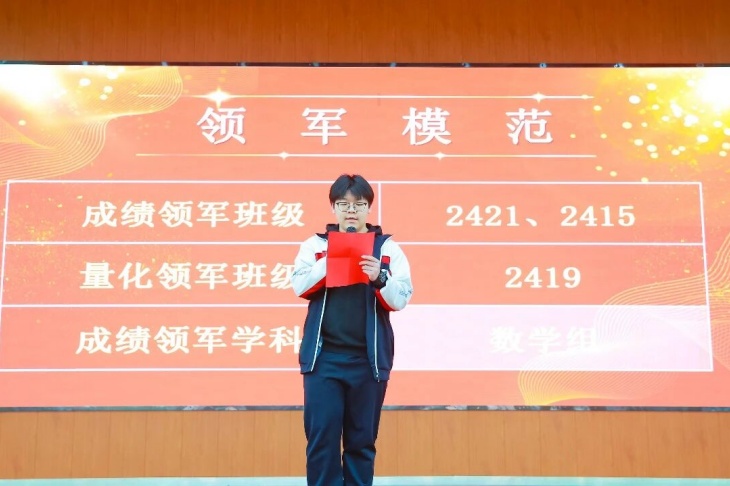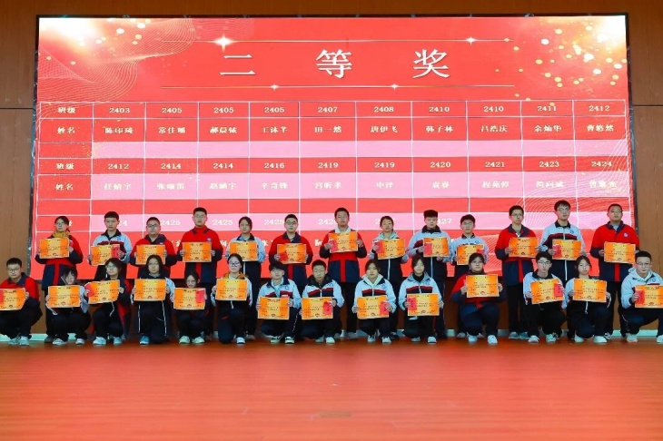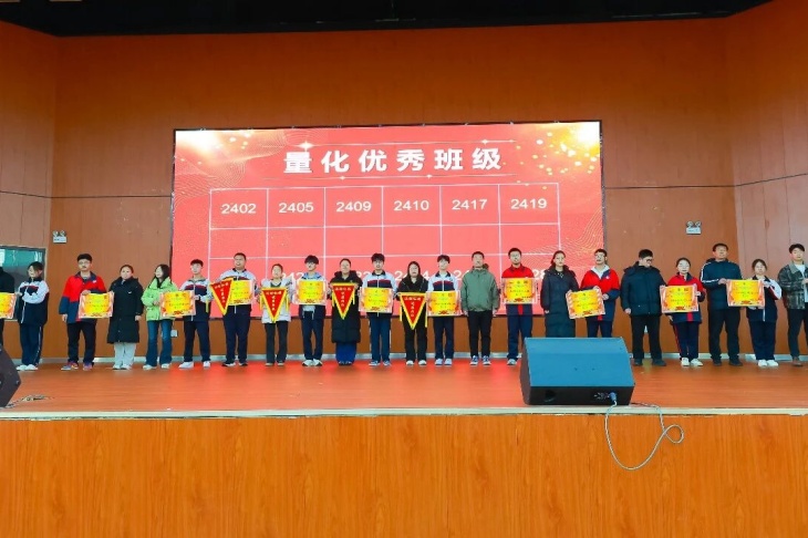 颁奖环节是本次大会的高光时刻,表彰奖项覆盖学生、教师、学科组、班级、级部等多个维度,一个个荣誉的揭晓,一次次热烈的掌声,见证着每一位奋斗者的汗水与荣光。成绩优秀学生分批次登台领奖,一等奖、二等奖、三等奖的获得者们,以勤学善思书写青春答卷,成为全体同学的学习标杆;成绩进步学生们更是让人眼前一亮,其中2407班贾爱翔同学从月考的896名跃升至期末275名,进步621名,用坚持与努力诠释了“突破自我”的深刻意义。