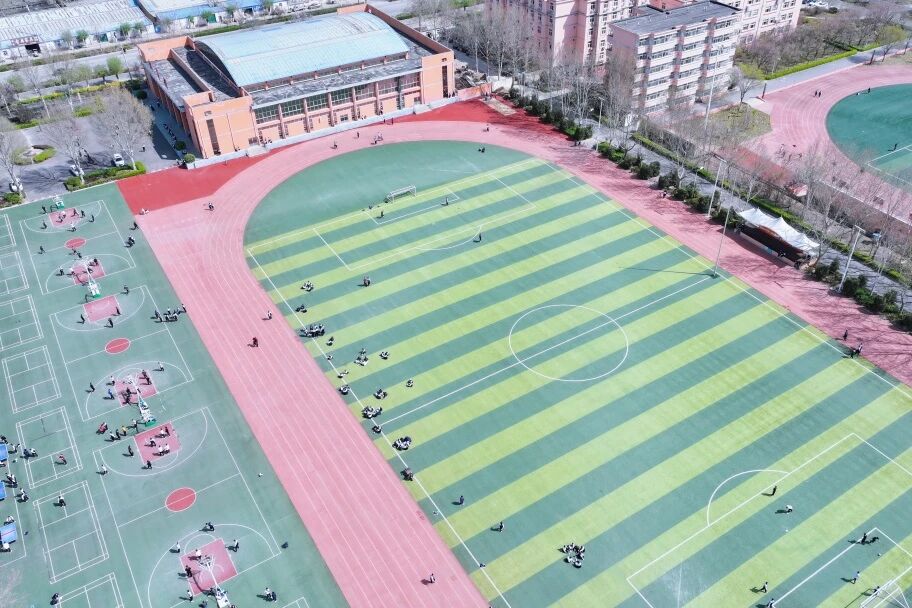 转至操场,色彩骤然鲜活。跑道上奔跑的身影划出青春的弧线,足球场上跃动的少年挥洒汗水,篮球架下传来清脆的击球声。从空中俯视,这片开阔之地如同校园的心脏,每一次跳动都充满力量。成群的学生在草坪上铺展开,笑声与呐喊随风升腾——这是属于春天的律动,更是属于青年的宣言:风华正茂,不负韶光。