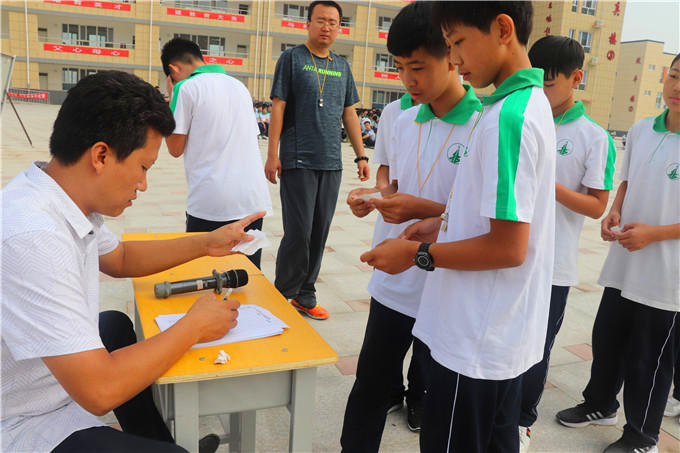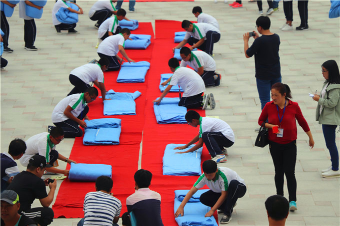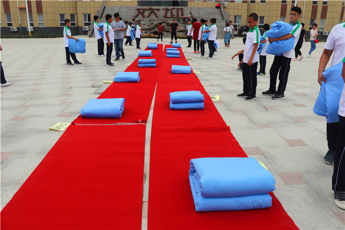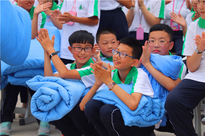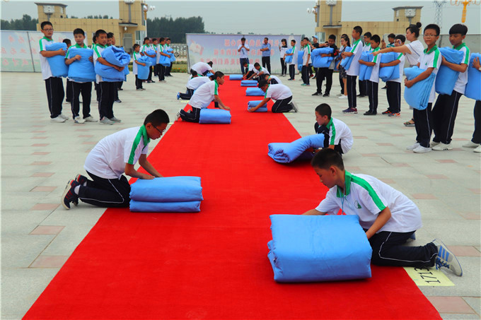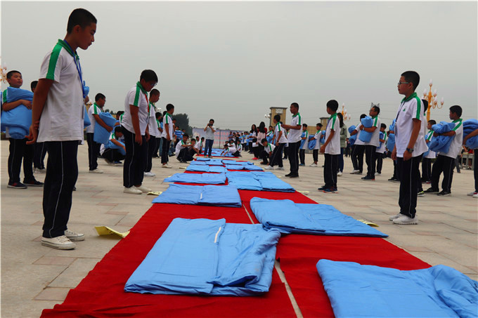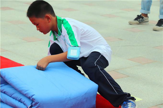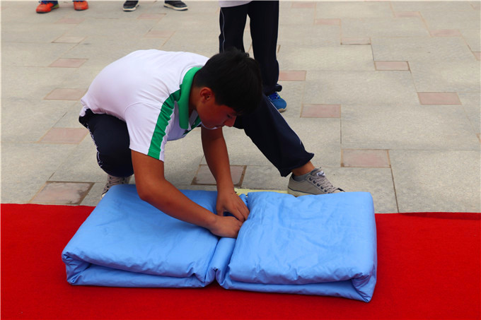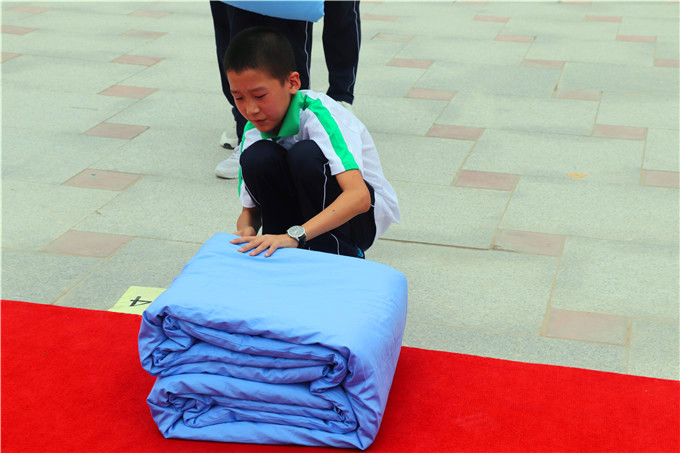 下午叠被子比赛,每班派出男女各四名选手参加比赛。比赛时间每人两分钟,随着裁判老师的一声哨子,同学们快速行动,按照老师教的叠被子流程,快速高效的完成了任务。几天的训练,已经初步培养了初一小同学们的独立生活能力。