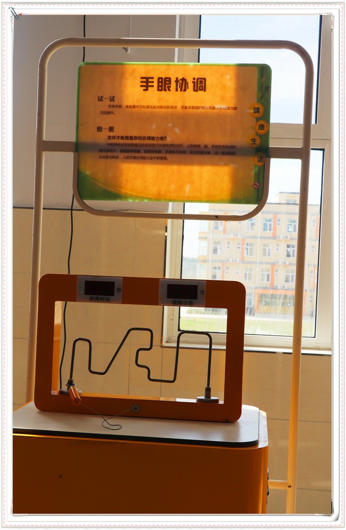 手眼协调:手持手柄,使金属环艳轨道从起点移动到终点,尽量用最短的时间和最少的碰撞次数完成操作。