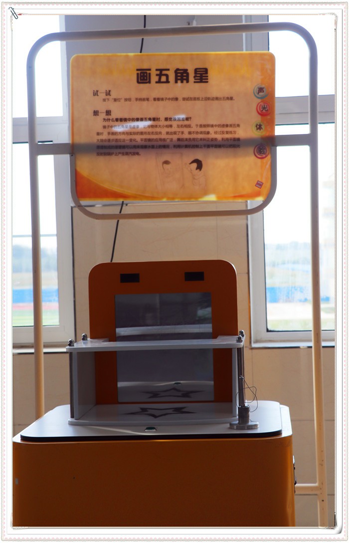 画五角星:按下“复位”按钮,手持画笔,看着镜子中的像,尝试在展板上沿轨迹画出五角星。