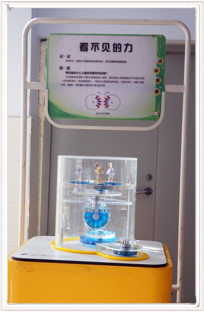 看不见的力:转动手轮,观察互不接触的转轮逐级传动,带动芭蕾舞者翩翩起舞。