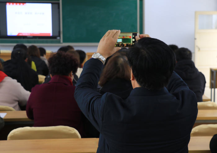 在多媒体教室内,李主任为同仁们作报告。李主任从我校概况、常规管理、初中的教学模式以及办学特色等方面向同仁们进行了细致讲解。随后,大家深入我校的教学课堂,观摩了语文、数学、英语、历史、政治等学科的随堂课。
