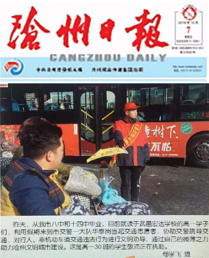 《沧州日报》头版为我校学子点赞,12月6日,我校高一学子来到市交警一大队华泰岗当起交通志愿者,协助交警疏导交通,对行人、非机动车道交通违法行为进行文明劝导,通过自己的微薄之力助力沧州文明城市建设。