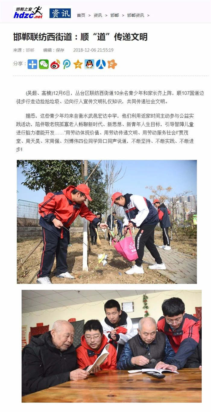12月的冬天虽然寒冷,却挡不住我校学子们如火的热情,同学们利用放月假的时间,纷纷走上街头、走进社区、深入敬老院,开展社会实践活动,宣传我校正能量,传播我校好声音,为我校代言。