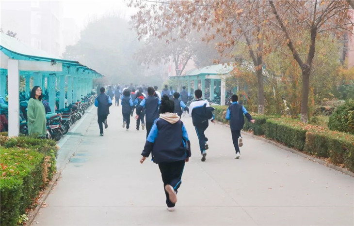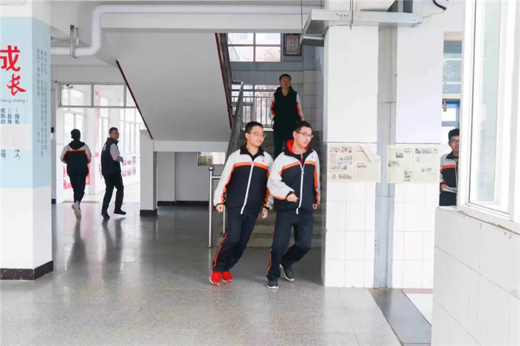 上午第二节课的下课铃声响起,学生便在第一时间内打开了教室的前后门。随着警报声的响起,他们冲出教室,在班主任和各楼层值班教师的引导下,按照疏散路线,迅速从就近的楼梯口有条不紊地撤离,进入空旷的安全地带,不到5分钟,主楼内的师生全部撤离教室。
