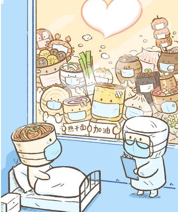 01 团结 右边的漫画被称为“最温馨的漫画”——生病的“热干面”躺在病床上,各地小吃纷纷为它加油。这生动地诠释了武汉发生疫情后,全国各地人民对武汉的关心和支持。 |