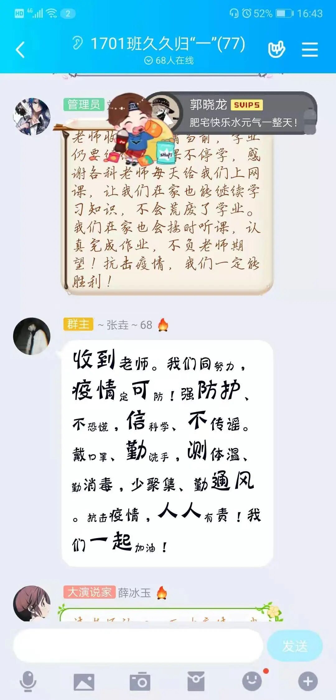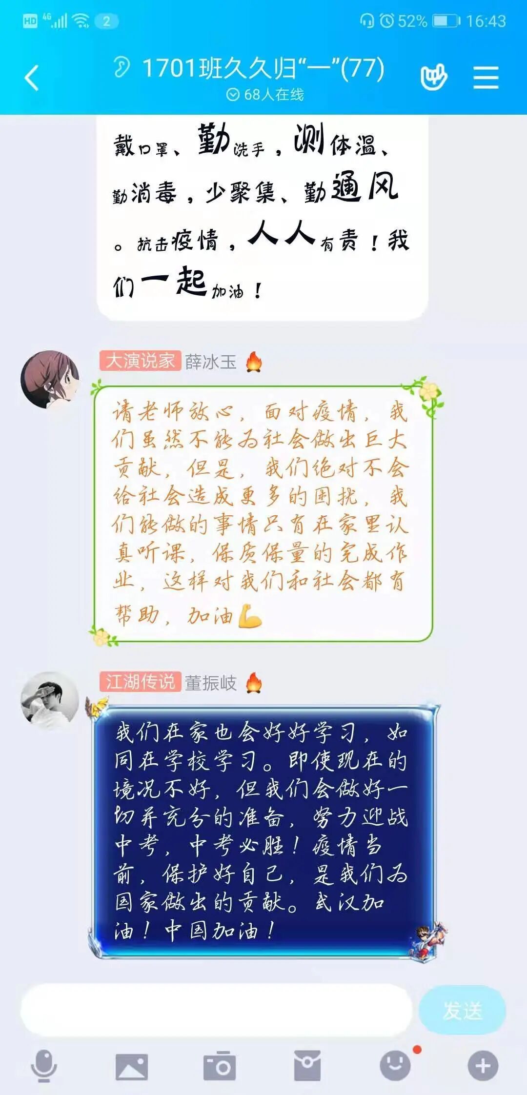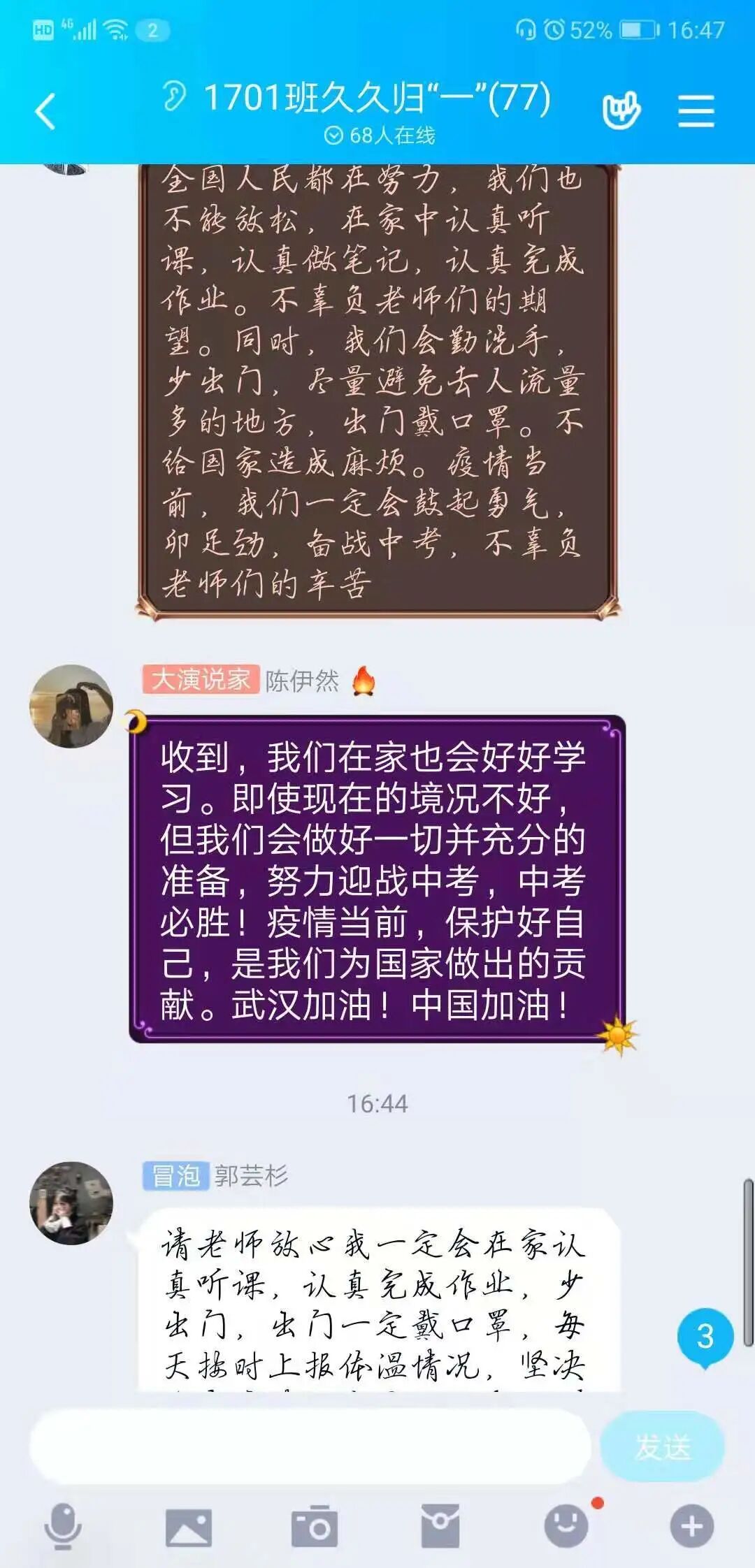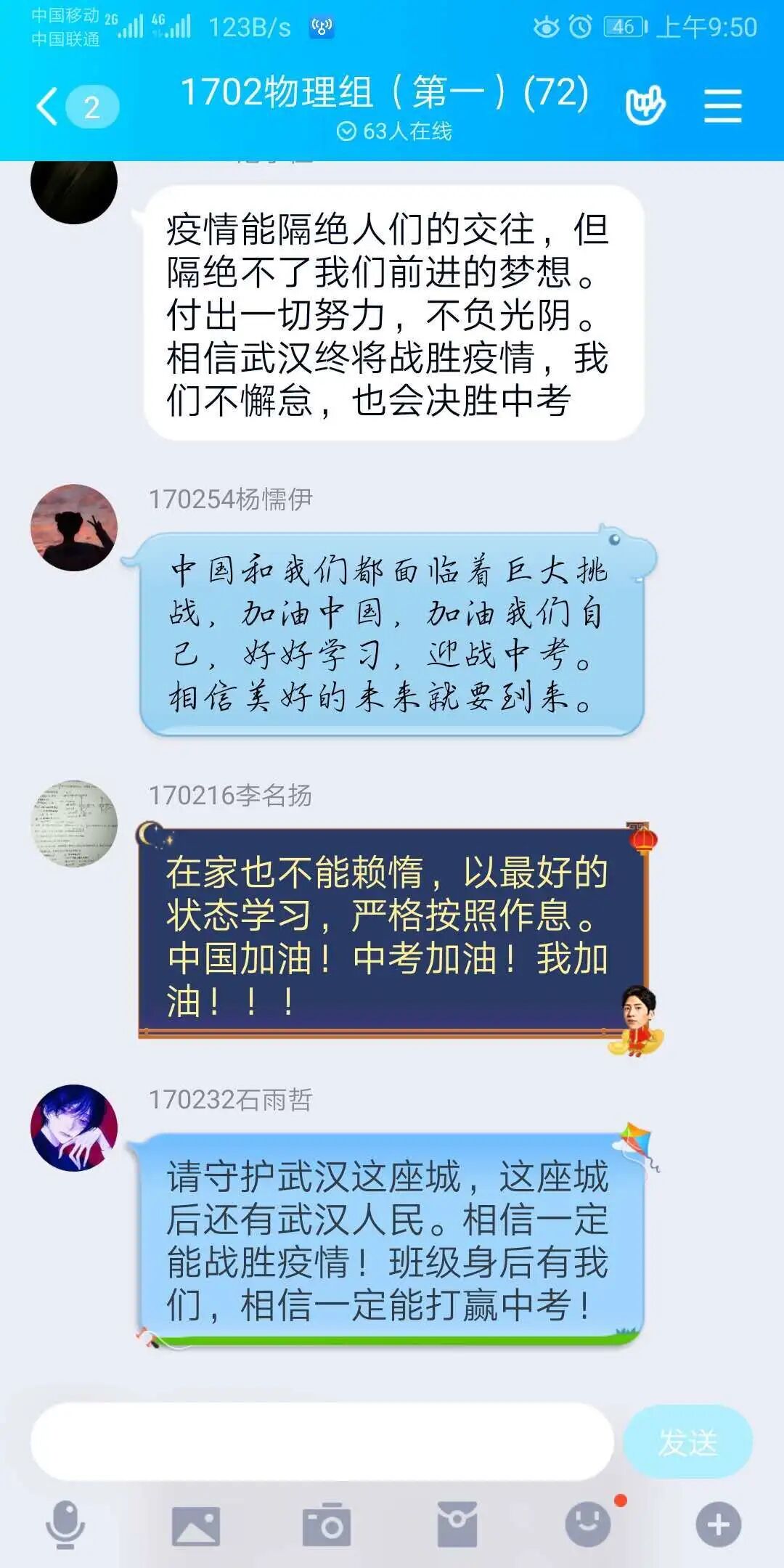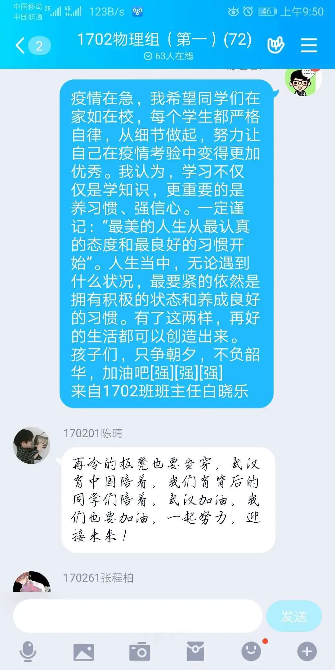 疫情在即,我希望同学们做到在家如校。学习不仅仅是学知识,更是学自律养习惯,强信心。最美好的人生往往从认真的态度和良好的习惯开始。只争朝夕,不负韶华,脚踏实地,赢得未来,加油,孩子们。