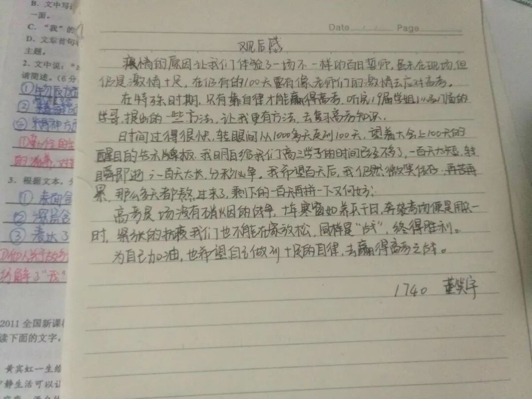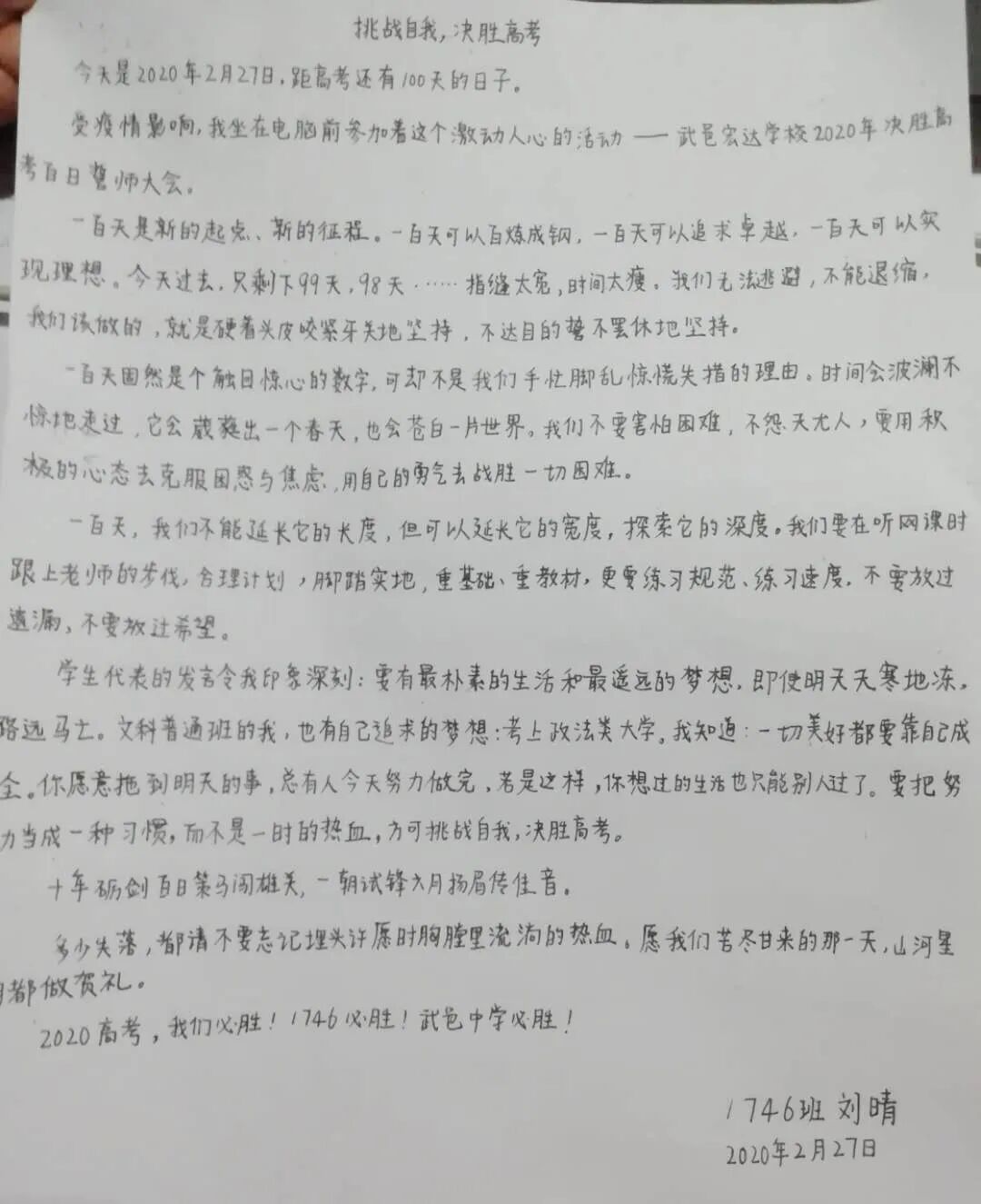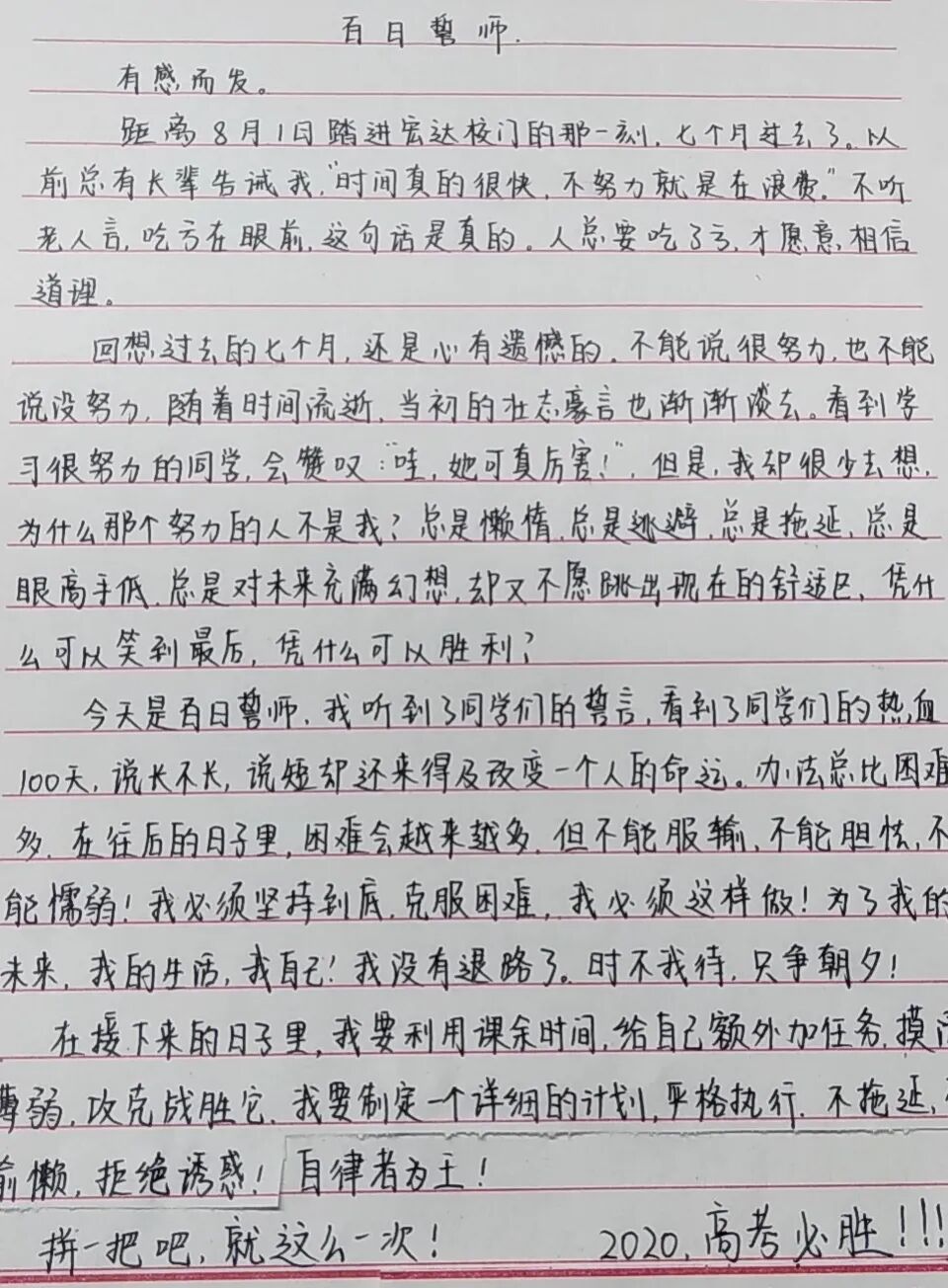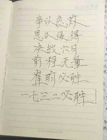 百日誓言铮铮在耳,耳畔鸣战鼓,鼓声阵阵,鞭策莘莘学子脚踏实地奋发进取。经过百日誓师的洗礼,同学们纷纷拿起手中的笔,写下心中的誓言,向着胜利,前进!