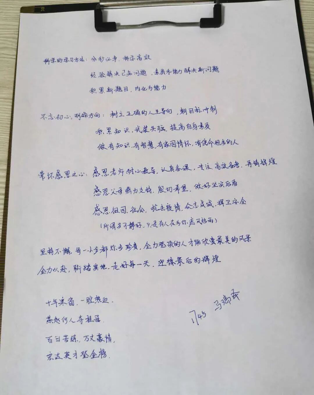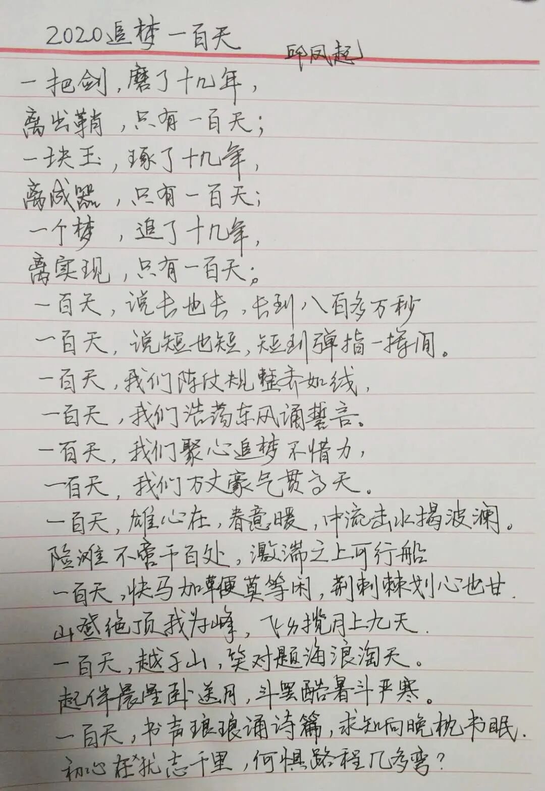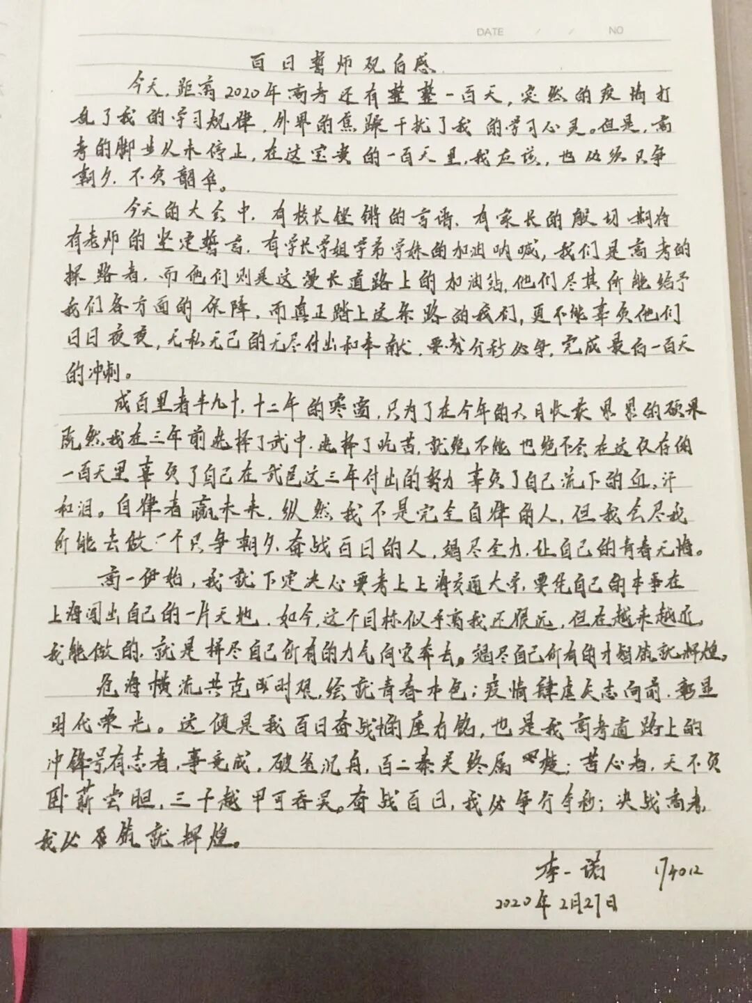 百日誓言铮铮在耳,耳畔鸣战鼓,鼓声阵阵,鞭策莘莘学子脚踏实地奋发进取。经过百日誓师的洗礼,同学们纷纷拿起手中的笔,写下心中的誓言,向着胜利,前进!
