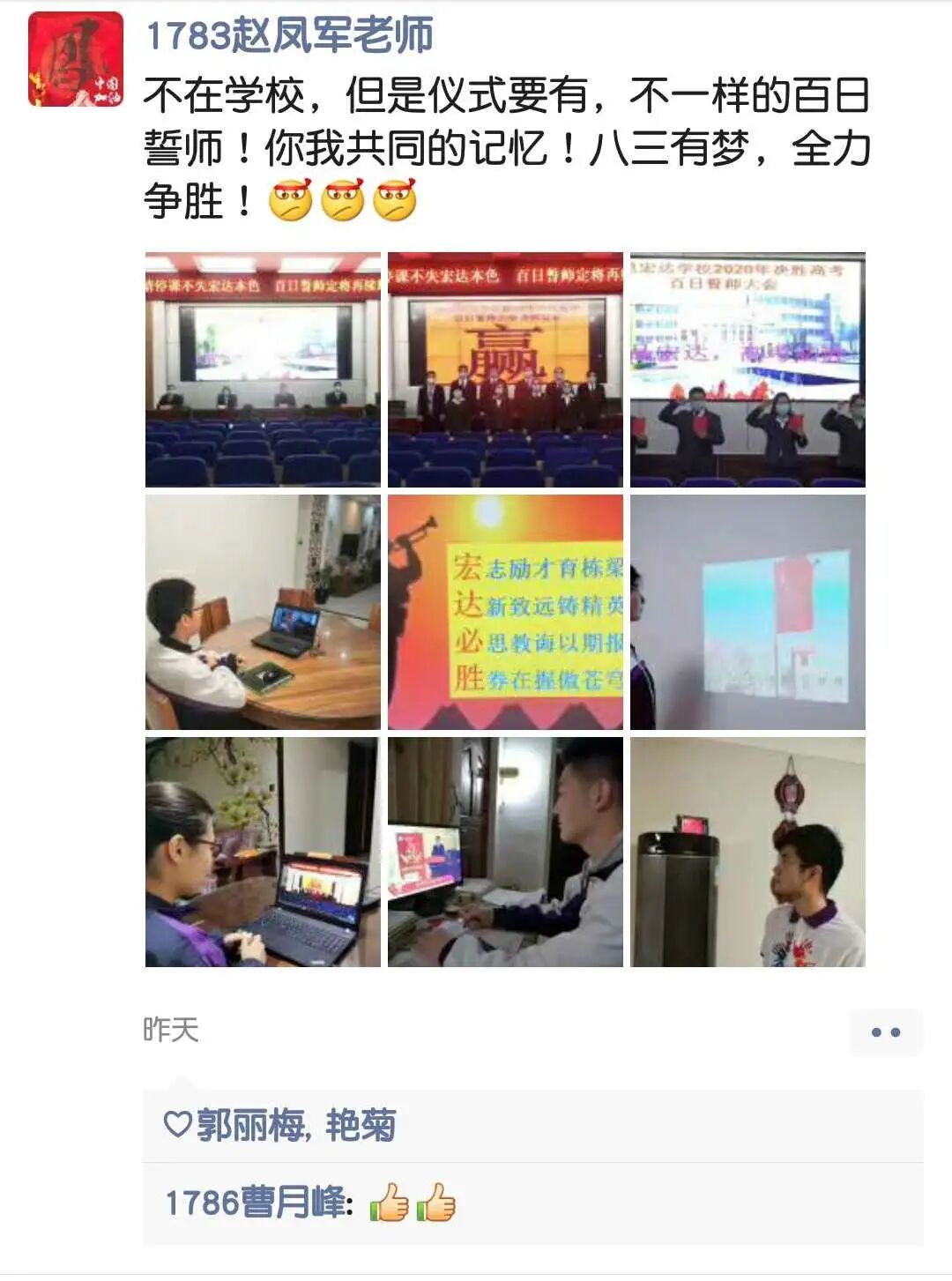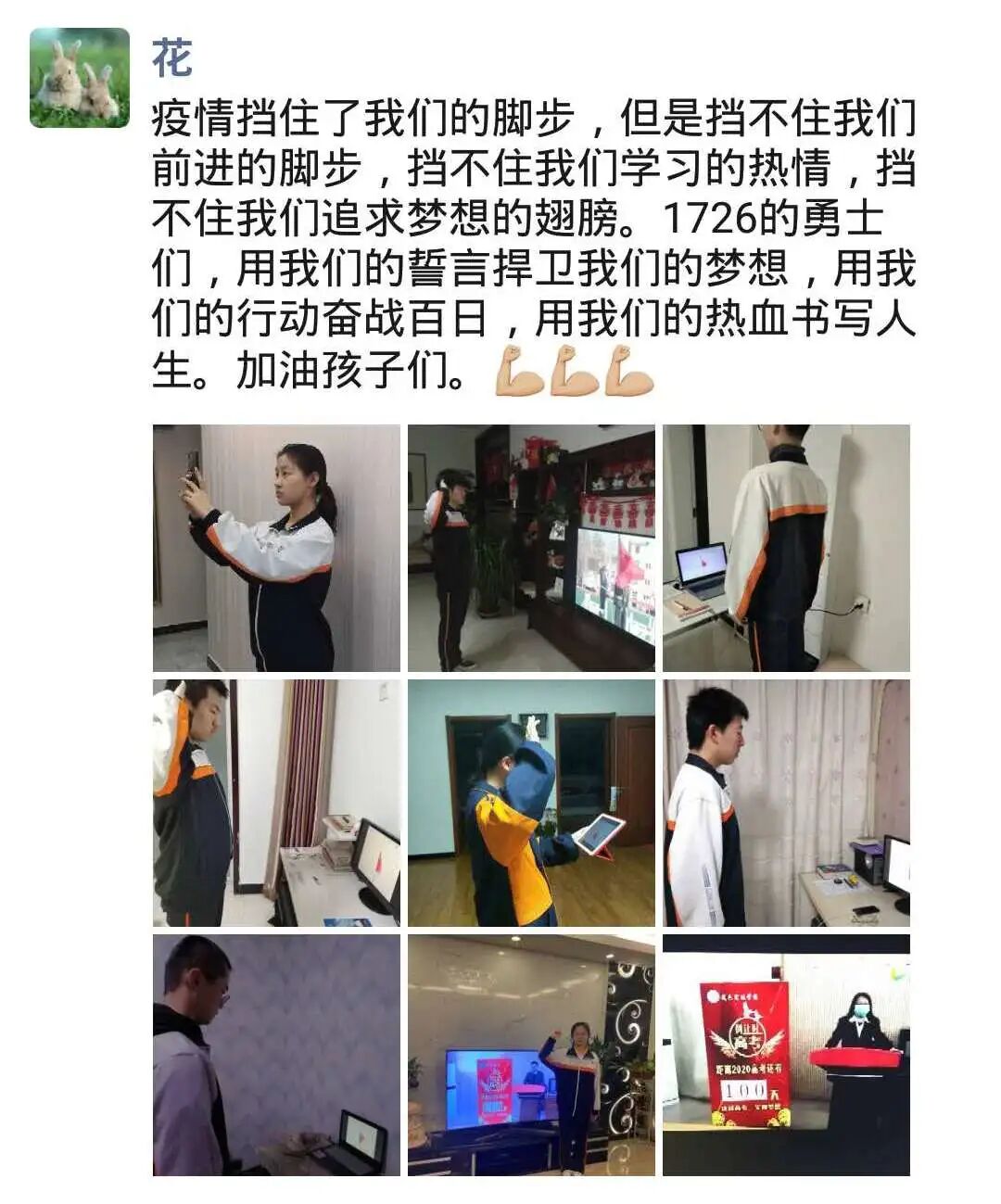 受疫情影响,高三延迟开学将近1个月,在学校的精心安排下,同学们也逐渐习惯了在家自主学习的模式,找到了在校学习的状态。2月27日,距离2020年高考还有100天的时间。在这特殊时期,百日誓师的仪式感也绝不能少,通过网络,我校师生参加了这个令人难忘的百日誓师活动,校长白志宏,副校长刘玉香、金耀辉、高智勇等校领导出席大会,高三年级全体主任参加大会,高三全体学生自觉穿上校服,在家参加百日誓师大会。大会由高三年级主任吴少杰主持。