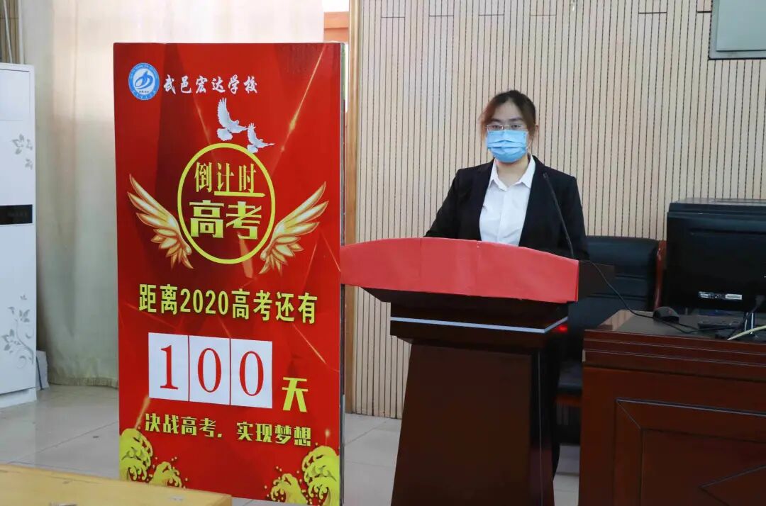 高三教师代表赵凤军、国晶晶两位老师在发言中表示,在未来的100天里,一定会恪尽职守,严字当先,尽职尽责的辅导学生,为他们保驾护航,与他们同甘共苦,同时,希望同学们在最后的一百天里有信心、决心、恒心、细心,科学规划,保持好脚踏实地的学风。最后,赵老师用一首小诗“宏志励才育栋梁,达新致远铸精英;必思教诲以期报,胜券在握傲苍穹”表达了“宏达必胜”的美好希冀。